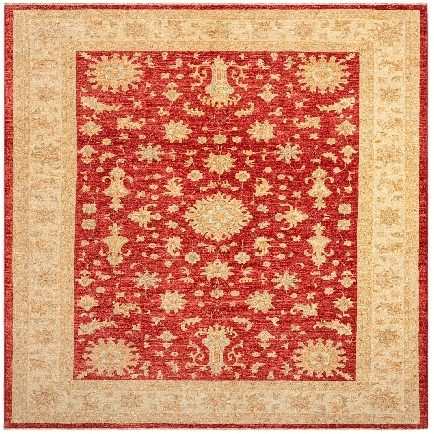 The Kaizar Collection presents a meticulously handcrafted 8x11 wool rug featuring a robust red background complemented by detailed motifs in beige and cream, offering an inviting warmth with its traditional design. The pattern showcases a harmonious blend of palmettes and floral scrolls, encapsulated within a graceful complementary border that frames the piece artfully.
