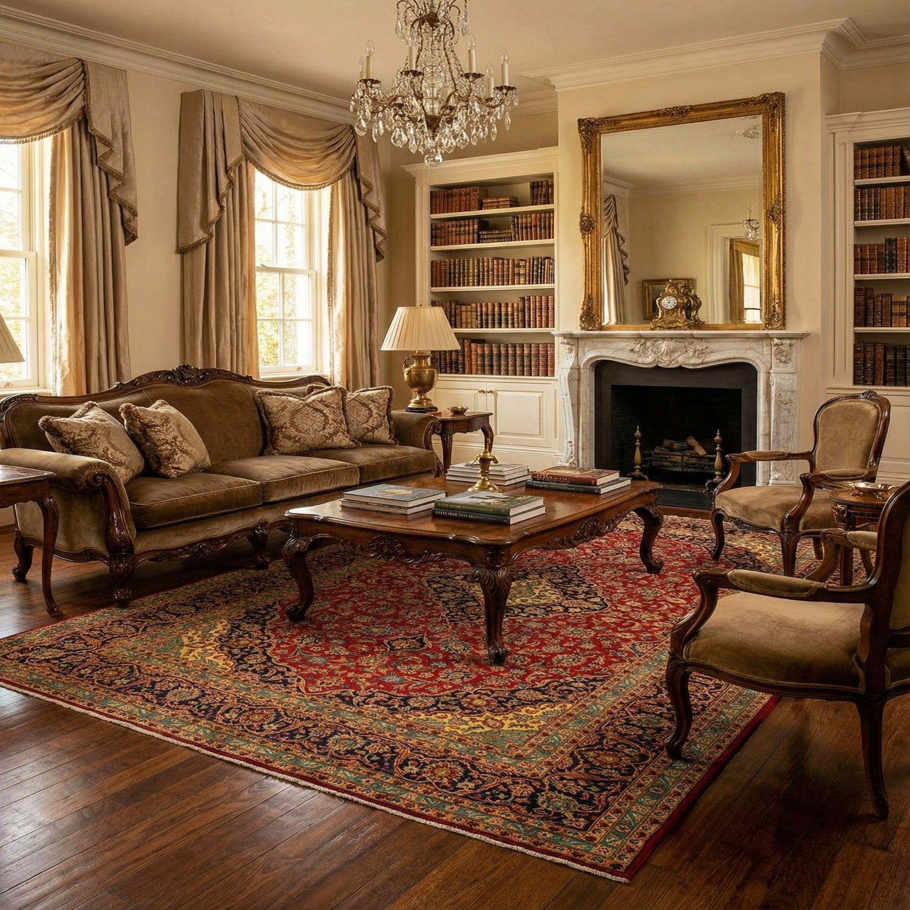 Hand made of wool, the surface feels supple underfoot with a soft, slightly lustrous pile that adds warmth and texture to a room. The hand-made construction produces clear motif definition and subtle tonal variation across the field. It works well as the anchor for a formal living area or dining room, beneath an upholstered seating group or dining table, and also complements a study or library with leather seating and warm wood finishes for a layered, collected look.