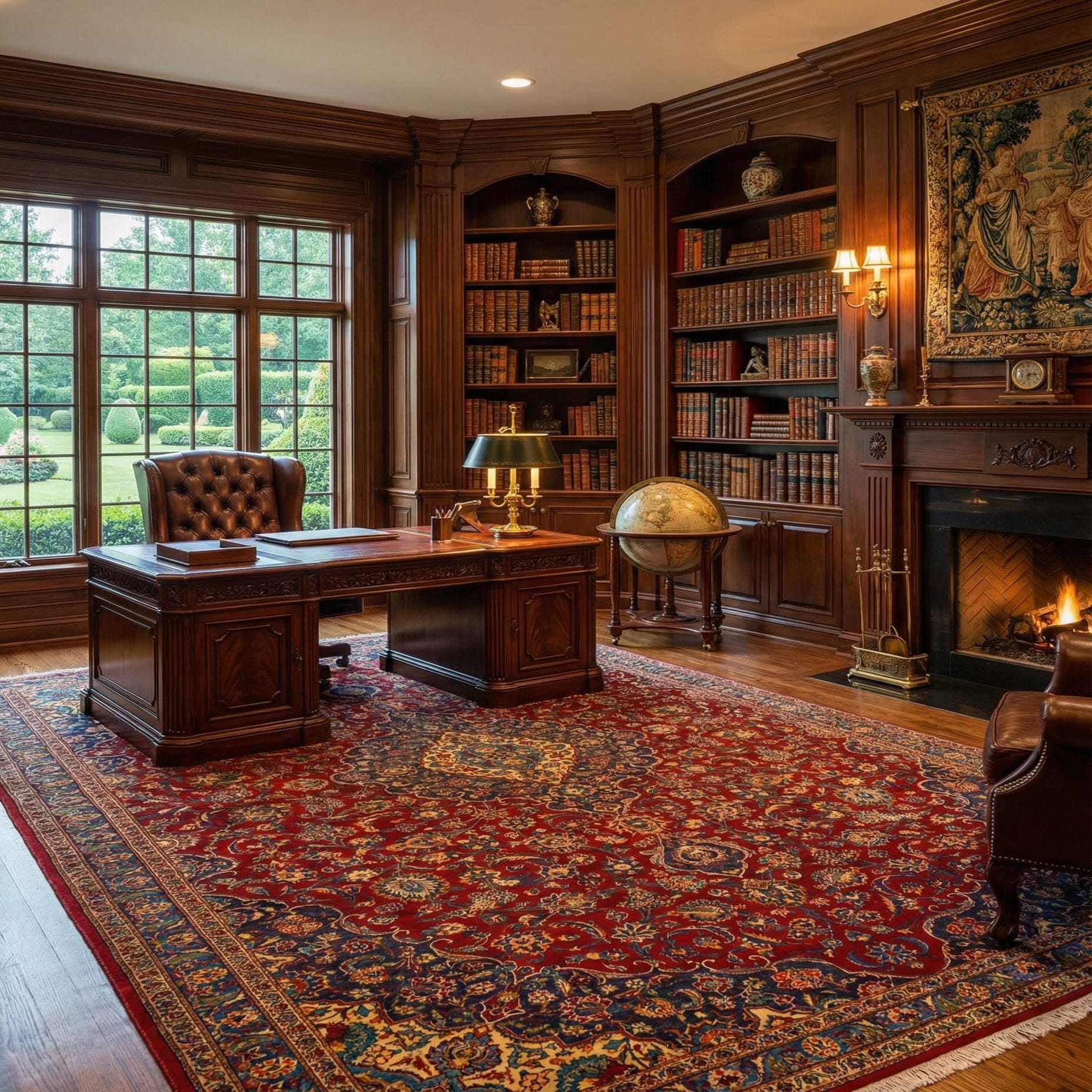 This rug's elegant design and warm color palette make it an ideal choice for traditional settings, imparting a sense of heritage and sophistication. It would also complement an eclectic decor where its intricate patterns and vibrant colors can create a focal point in a room with muted or neutral furnishings. Thanks to its versatile size, this piece can anchor a living room seating area, add definition to an open-plan space, or serve as an impressive backdrop in a formal dining room.