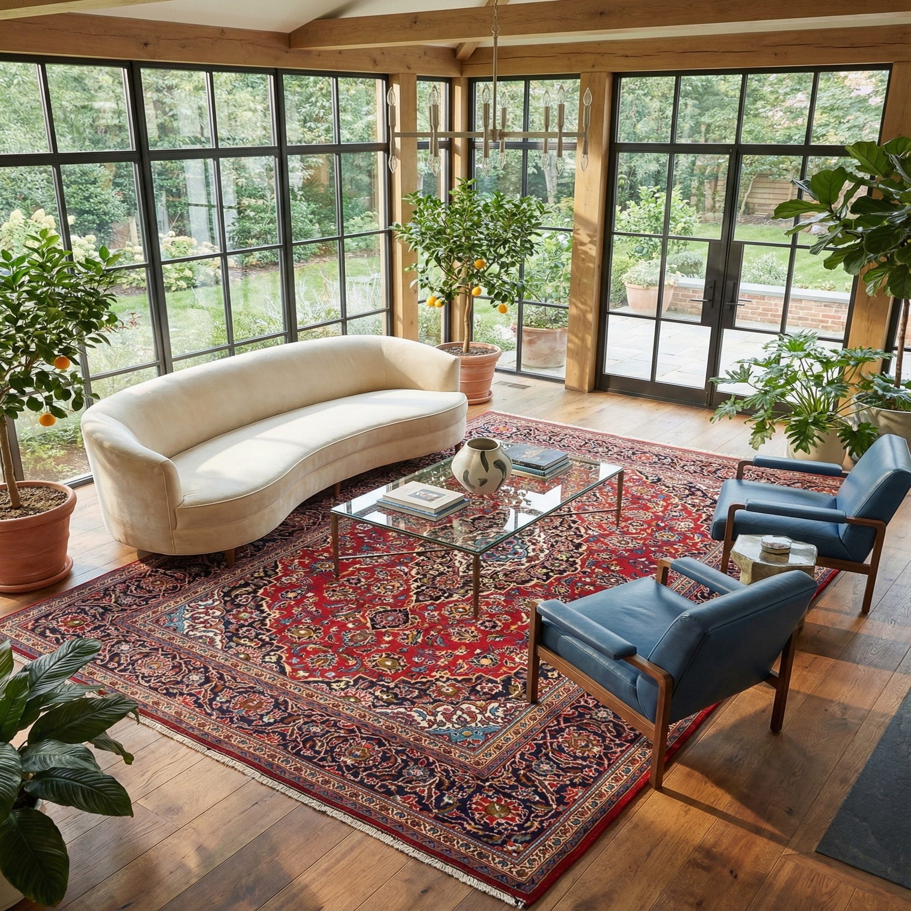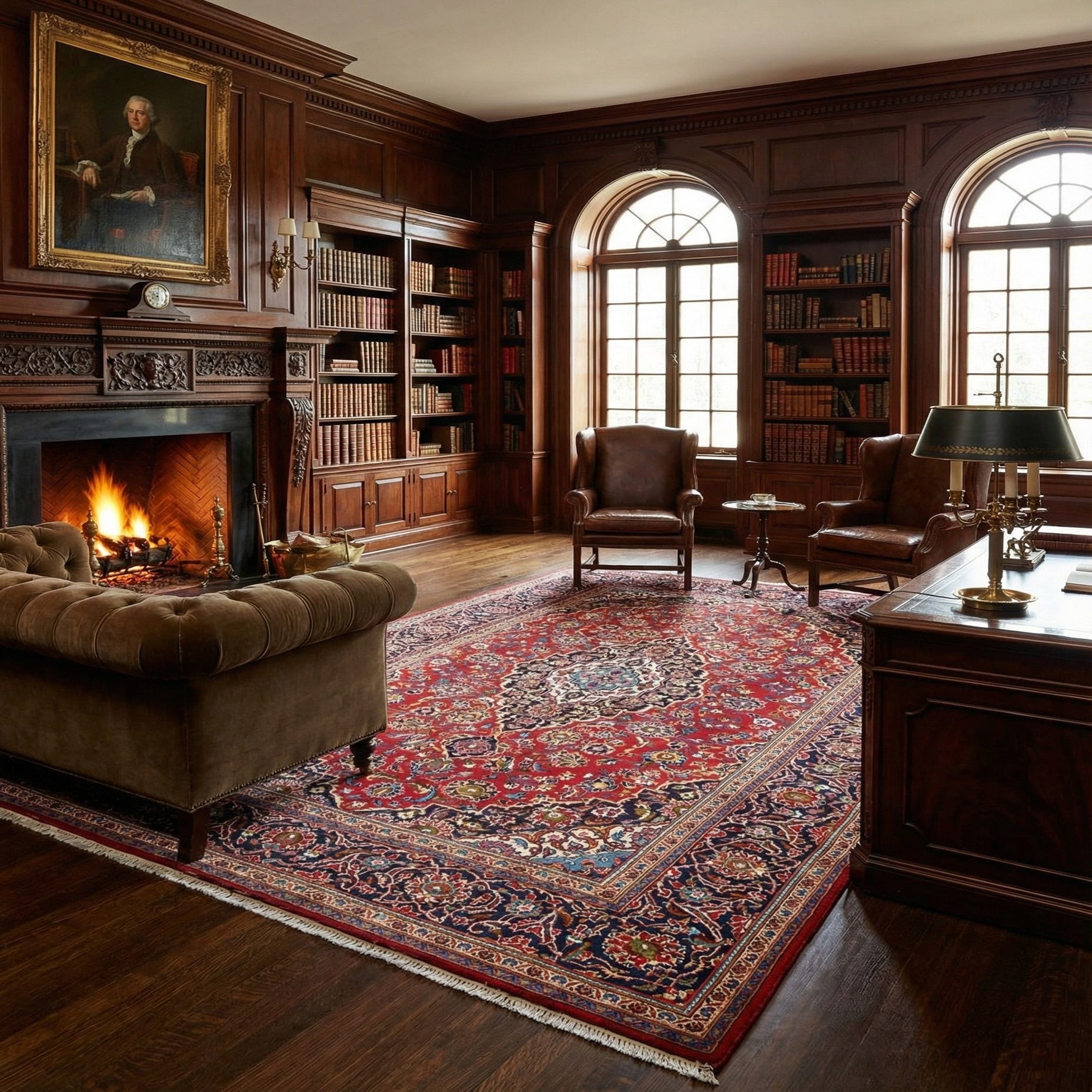The Kashan rug's robust design and color scheme make it an excellent candidate for interiors seeking a classic and sophisticated anchor. Its rich tones and ornate patterns are best suited for spaces such as formal living rooms, dining areas, or stately offices, where it can serve as a focal point. The rug's color palette provides versatility, allowing it to complement both warm wood tones and cooler, neutral settings.