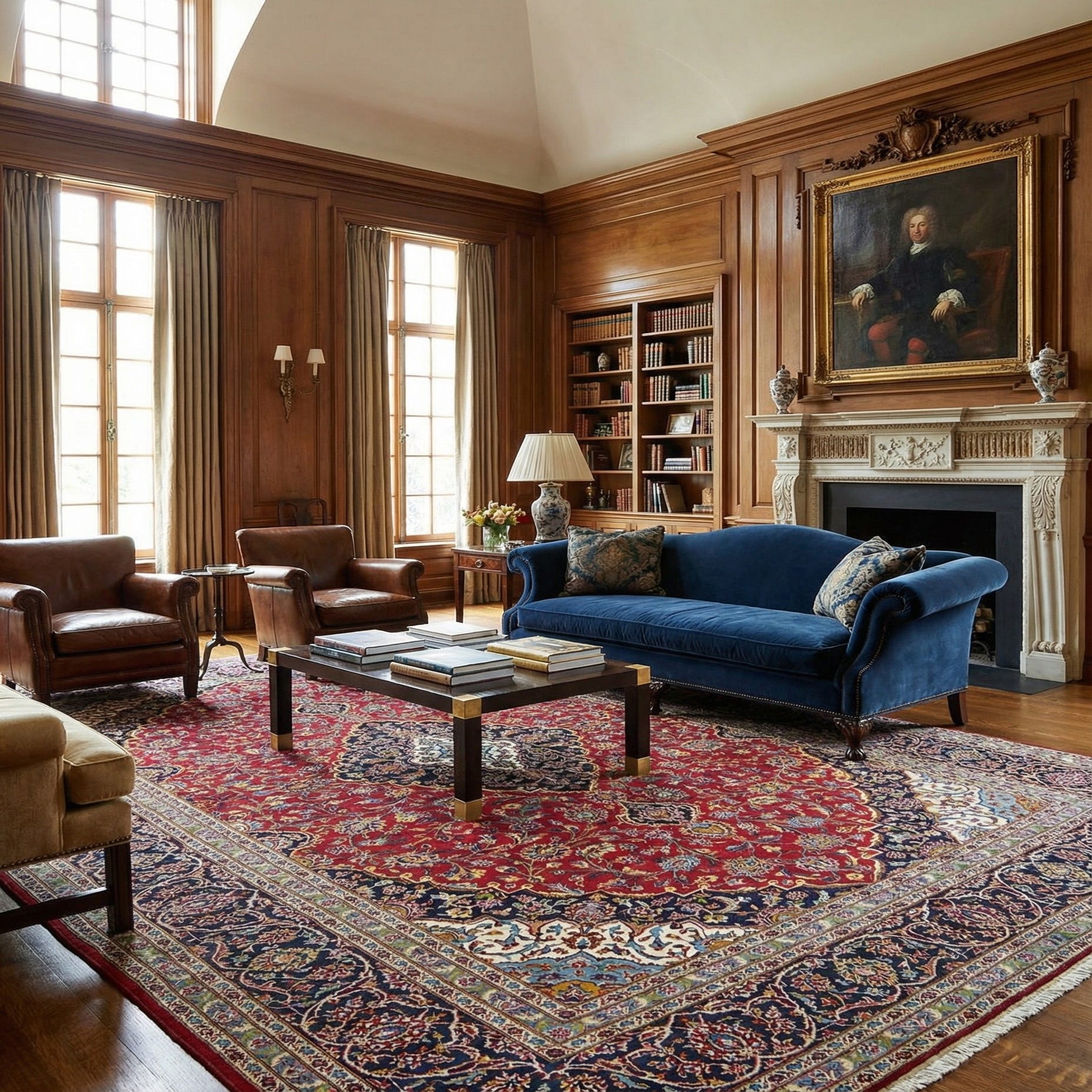 A luxurious 8x11 rectangular Persian rug featuring a rich red field with intricate floral and medallion patterns, framed by a dark blue border.