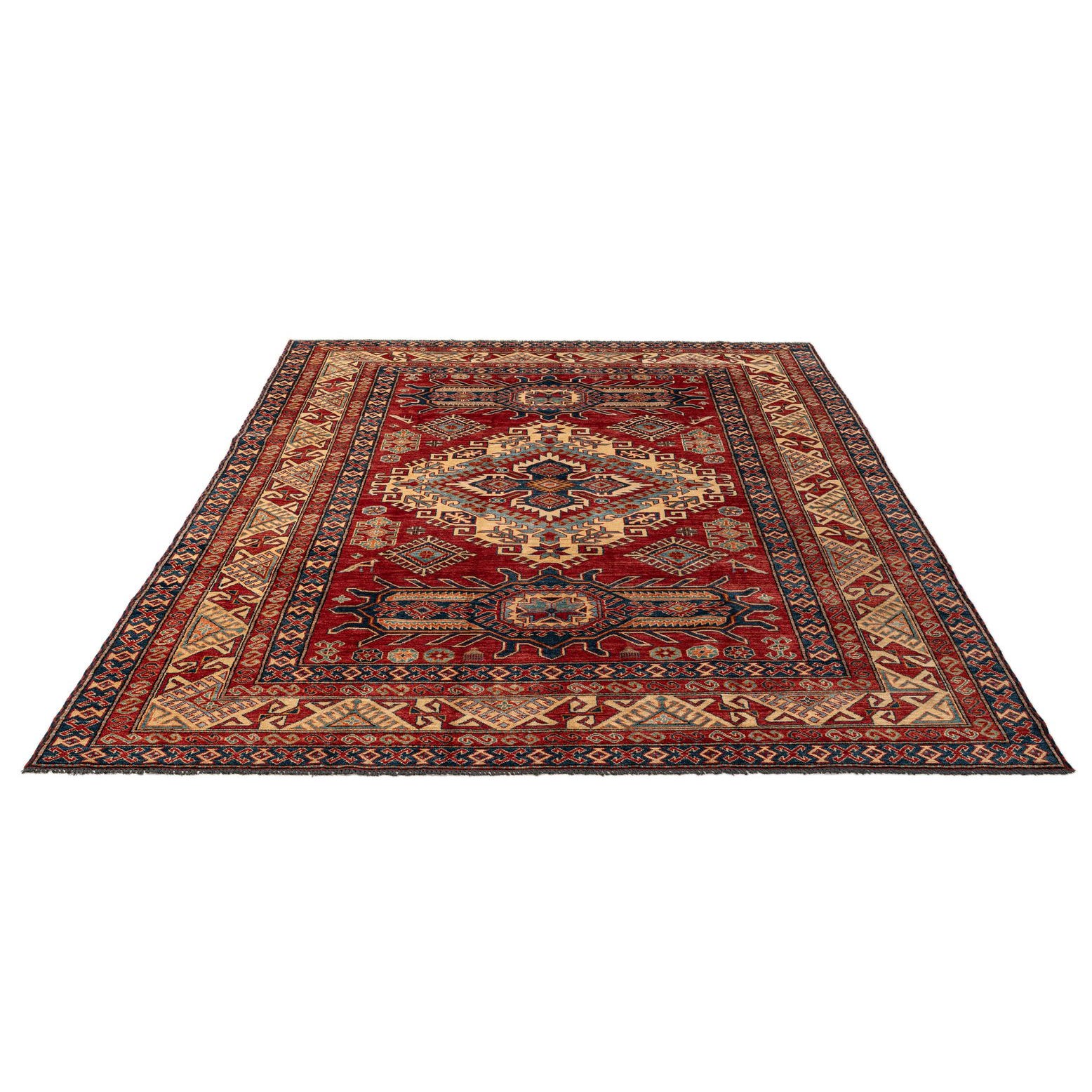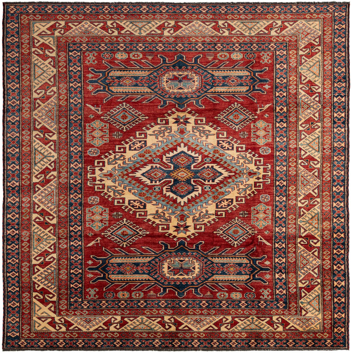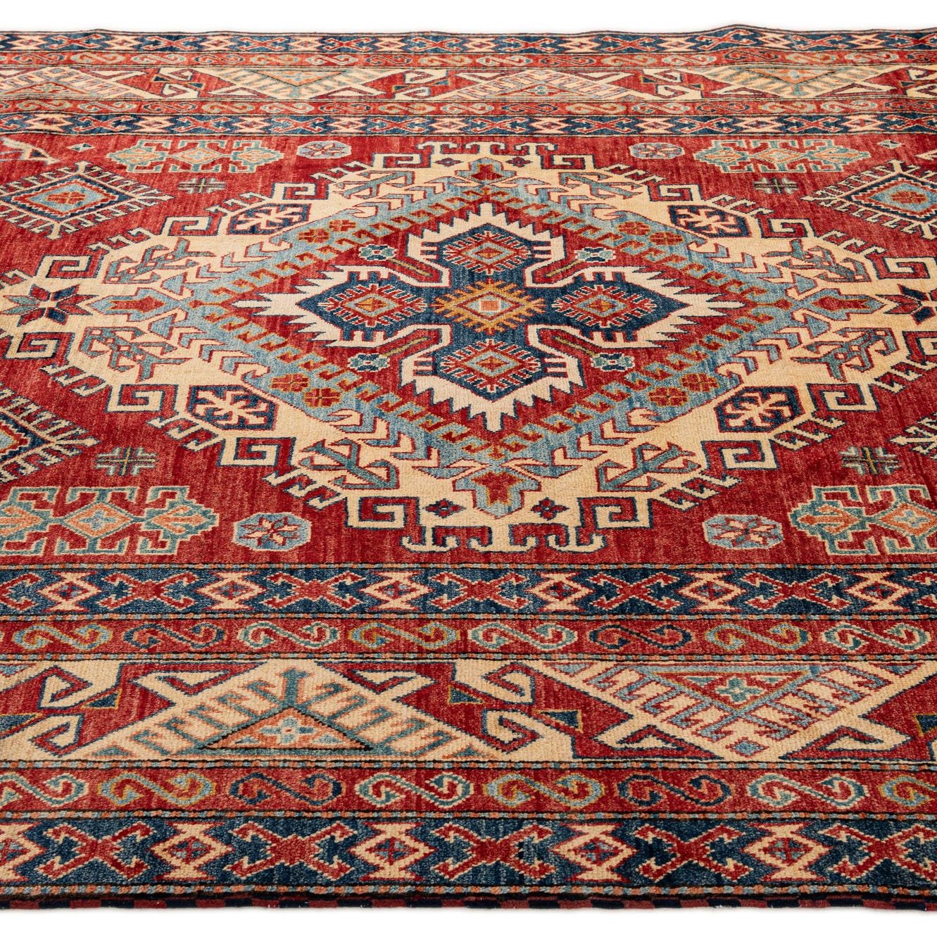 A bold central medallion and stepped geometric motifs sit on a deep red field, surrounded by layers of angular borders in navy, tan, light blue, brown and pops of orange. The design draws on traditional tribal geometry — small diamonds, hooked motifs and stylized floral forms are arranged with crisp symmetry so the pattern reads clearly across the surface. The red background provides a warm, grounded backdrop that makes the lighter tan and light-blue accents stand out.