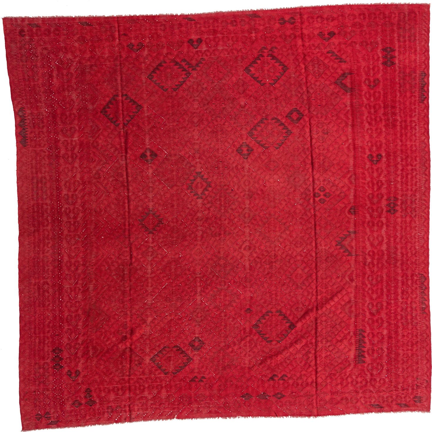 The Kilim Fars collection presents a hand-woven cotton rug in a generous 8x11 size, adorned with a bold and inviting red background. The pattern is an alluring blend of geometric shapes and tribal motifs, rendered in a subtle gray that complements the red without overwhelming it. The design offers a visual texture that adds depth and interest to the flat-woven construction, while the presence of fringe adds a traditional and tactile finish to the piece.