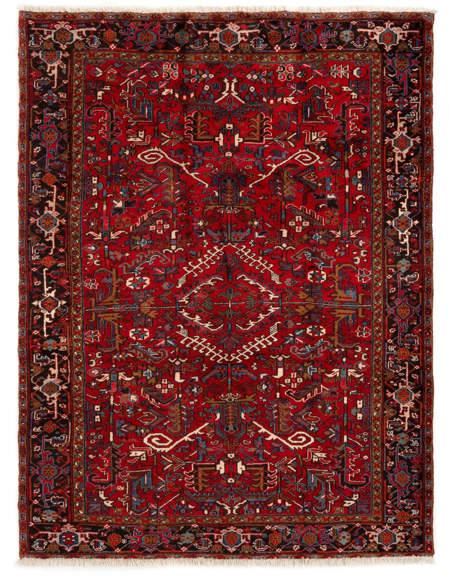 Primary color is Red. Colors in this rug include: Red, Black, Blue, Brown, Cream.