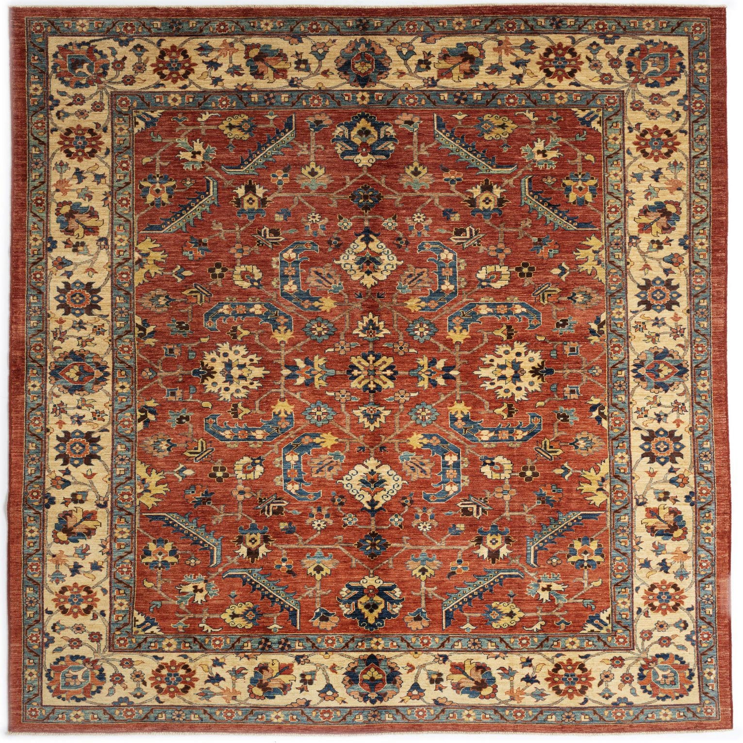 The Sara Collection presents a hand-made 8x11 rug crafted from 100% wool, offering both durability and comfort underfoot. This piece features a striking pattern with a rich red background, complemented by a harmonious blend of cream, blue, brown, dark blue, and orange accents. The intricate design showcases traditional motifs that evoke a sense of timeless elegance and artistry.