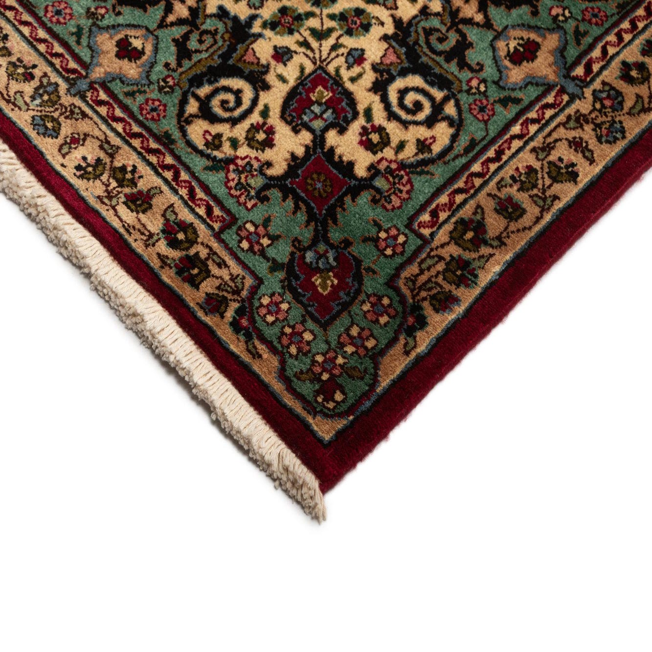 A rich red field anchors a classic medallion layout, where a finely detailed central motif gives way to delicate floral arabesques and scrolling vines. A broad beige cartouche border frames the composition, creating a clear visual transition from rug to floor. Hand made of 100% wool, the pile has a dense, tactile quality—soft and springy underfoot with a natural warmth that highlights the intricate knotwork and brings depth to the red and beige palette.