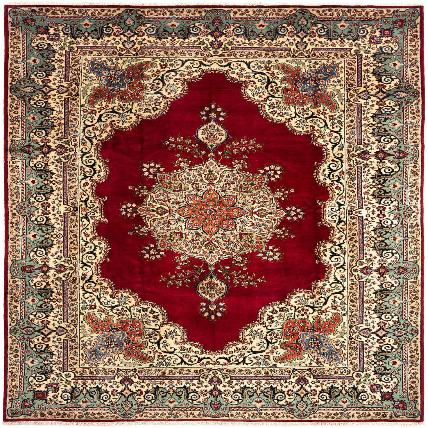 An 8x11 rectangular Persian wool rug featuring a rich red field with an intricate floral medallion and a cream border.