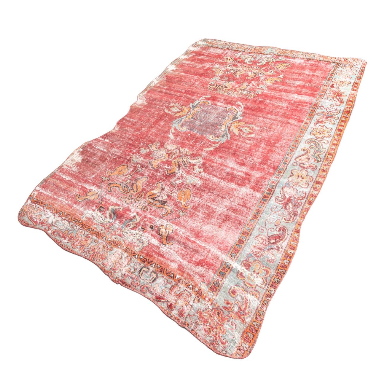 A distressed 8x11 rectangular Persian rug in shades of red with an ornate floral pattern and light blue border.
