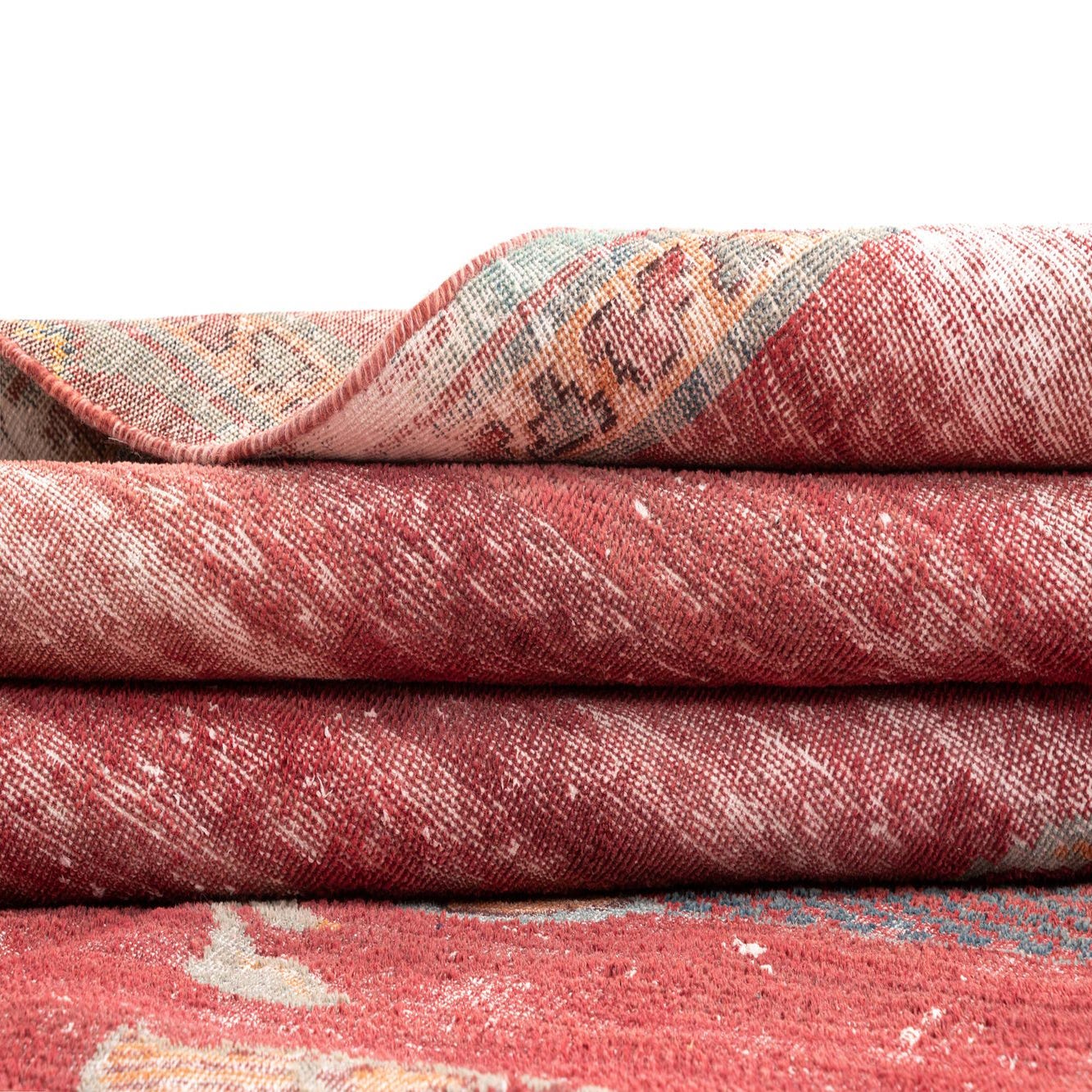 The Vintage Royal collection presents a hand-made area rug of 100% wool, sized at 8x11 feet. This rug features a patinated red background, subtly accented with a diverse spectrum of colors, including red, blue, orange, and brown, creating an intricate and refined visual texture. Each corner sports elegant, traditional floral motifs that stretch toward the center, gently fading into the rug's red core, suggesting a history of grace and longevity.