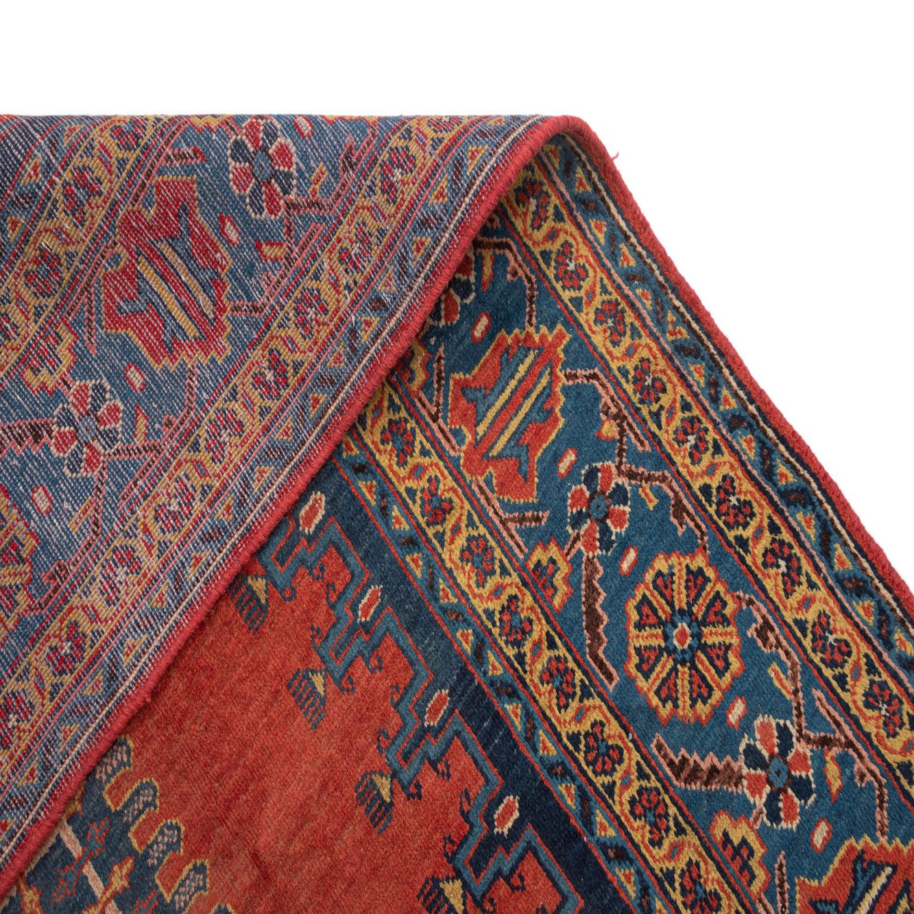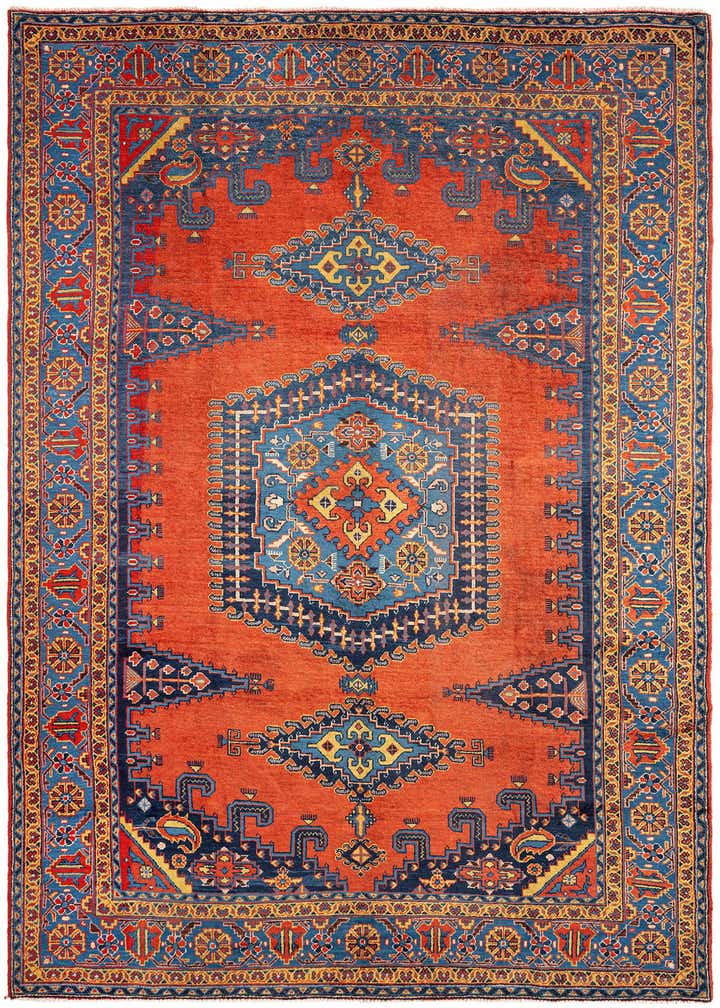 This Viss collection rug boasts a vibrant and richly colored design, featuring a powerful red background complemented by a harmonious array of blue, yellow, brown, pink, and dark blue. The pattern presents a traditional motif, with a central geometric medallion anchored by corner pieces and a detailed border that frames the composition. Each element within the design is highlighted by the varied color palette, ensuring that the intricate patterns stand out distinctly against the red background. The texture of this hand-made, 100% wool rug ensures a soft, inviting feel underfoot, coupled with the inherent durability and longevity that wool provides.