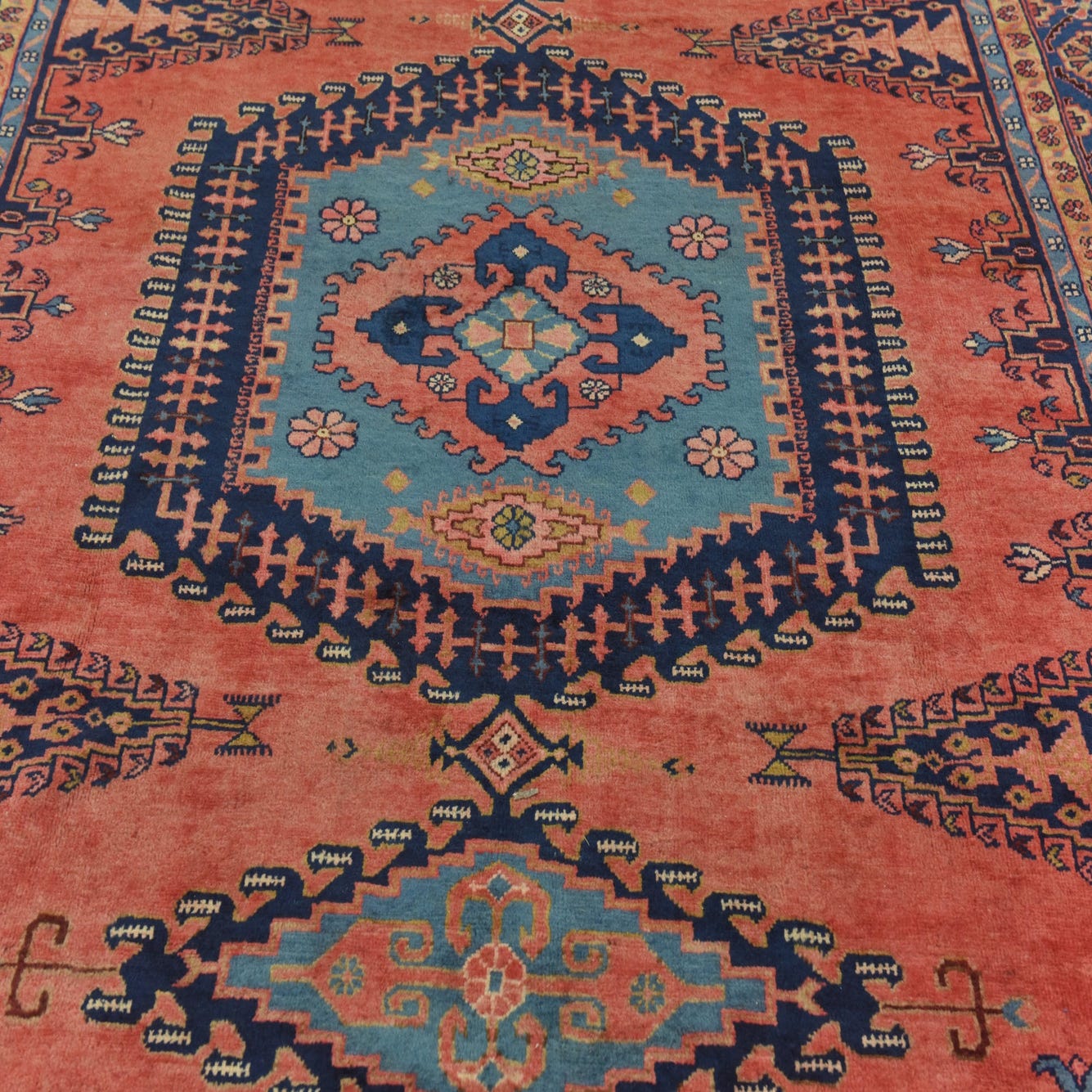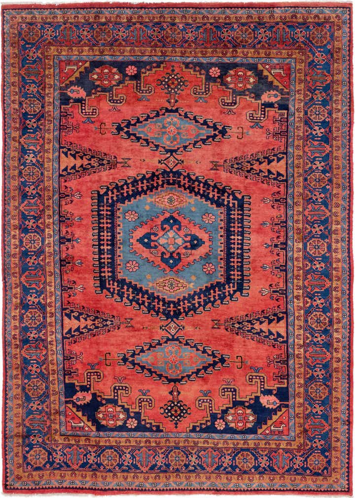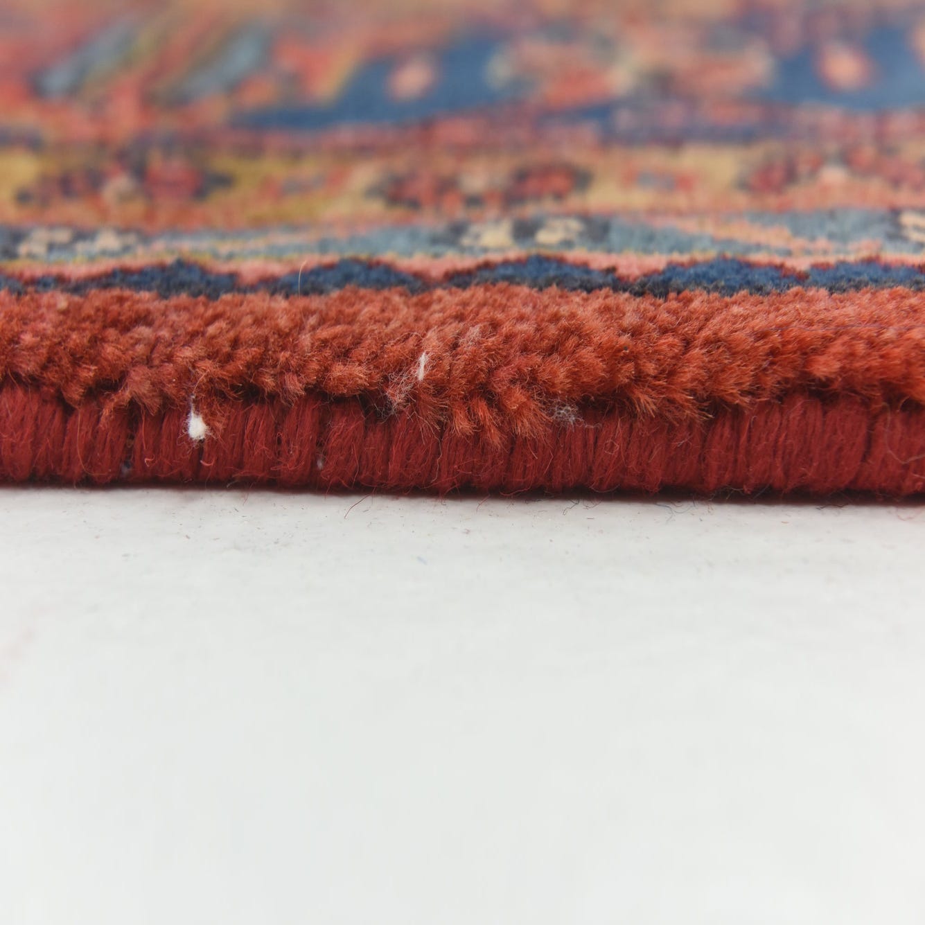 Primary color is Red. Colors in this rug include: Red, Blue, Black, Light Blue, Navy Blue, Gold, Salmon.