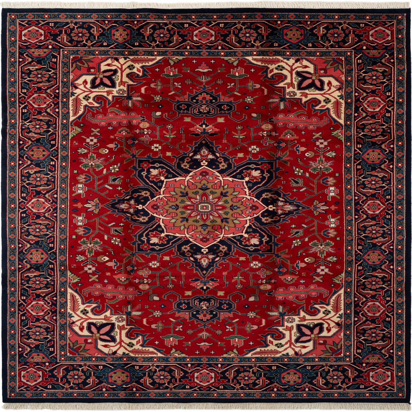 A rectangular 8x12 Heriz wool rug in rich red with a central medallion and intricate traditional Oriental patterns, featuring navy blue borders.