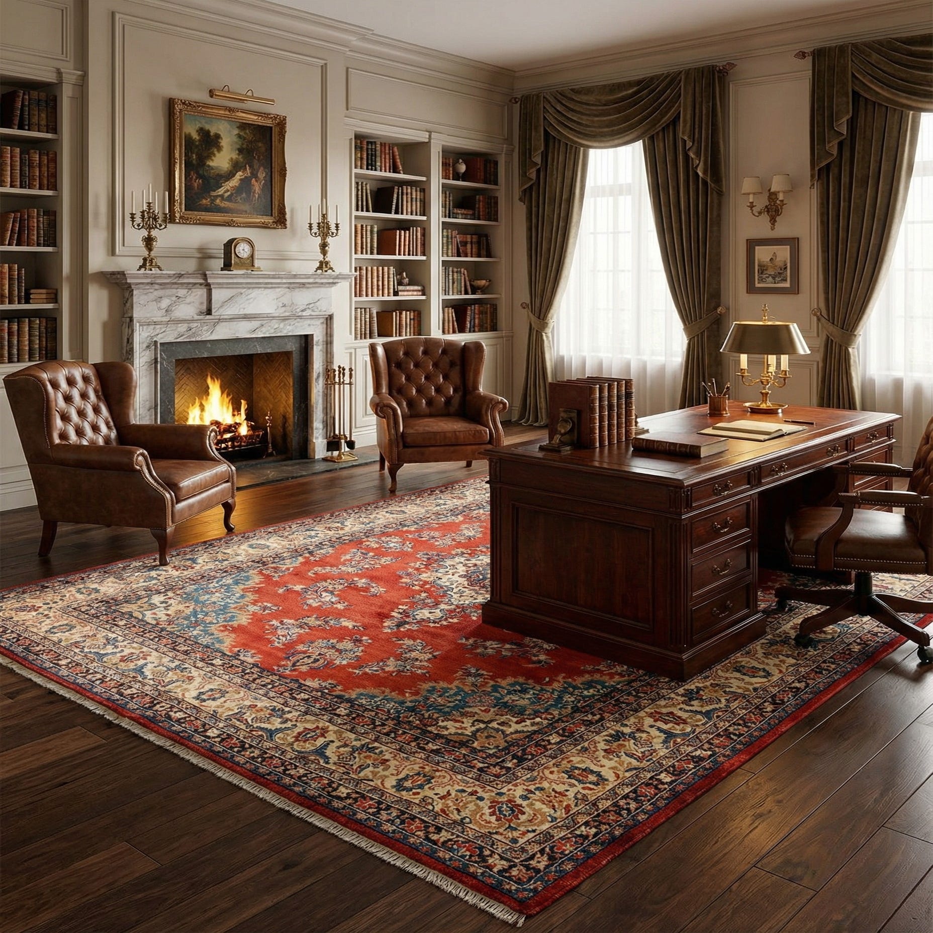 This rug would complement traditional decor and can act as a statement piece in more neutral settings. Its timeless pattern enables it to be versatile for applications ranging from anchoring a formal living room to adding a touch of elegance in a dining area. It pairs exceptionally well with polished wood furniture, antique pieces, and rich, leather elements to create an ambiance that is both cultivated and welcoming.