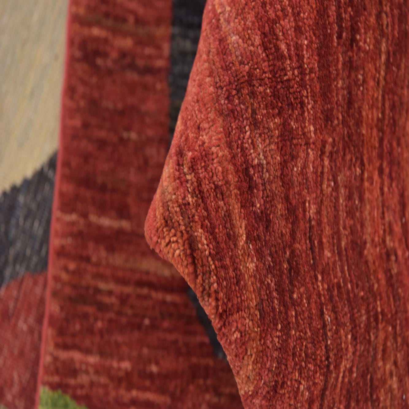 The rug’s contemporary, organic motif works well as an anchor in a modern living room or beneath a dining table where the bold red ground can balance warm wood tones and neutral upholstery. Pair it with mid-century furniture and matte black accents for a tailored look, or layer it into an eclectic space with plants and mixed textiles to highlight the green and light-blue accents. The hand-knotted construction and substantial wool texture suit main living areas where both visual impact and lasting material quality matter.