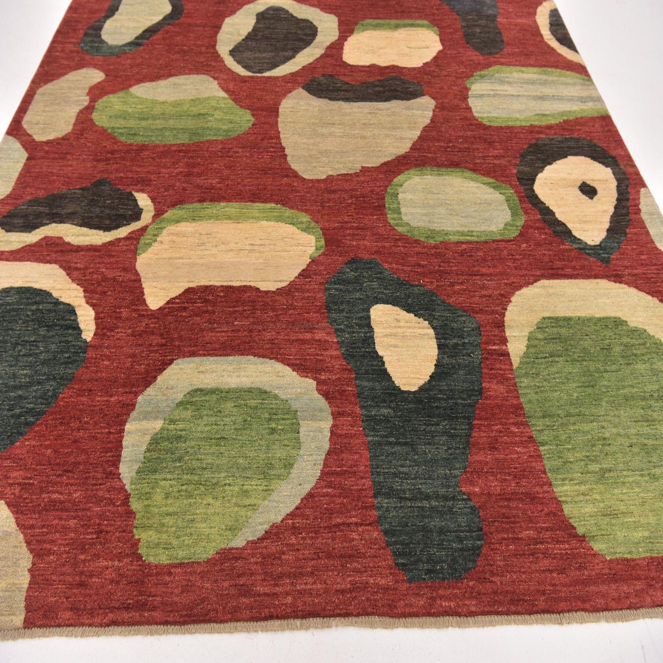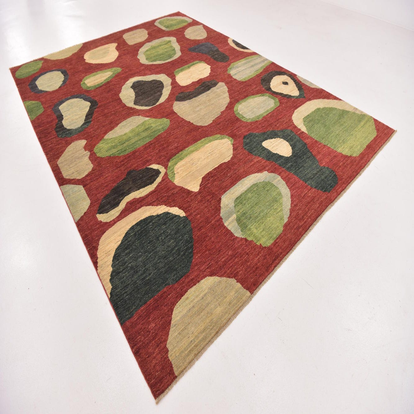 A warm red field sets the stage for an artful, organic pattern of pebble-like forms in green, ivory, light blue, black and brown. Each shape has a slightly irregular, hand-drawn edge and layered color washes that read like a painterly composition across the surface. Hand-knotted from 100% hand-spun wool, the pile has a soft, tactile feel with subtle color striations and a natural luster that gives the design depth when you run your hand across it.