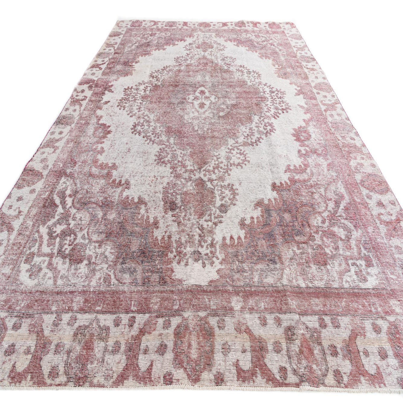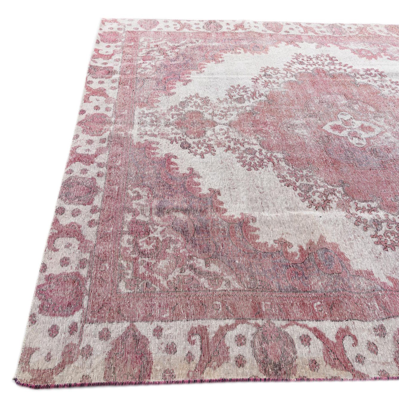 An 8x12 rectangular Ultra Vintage Persian rug in faded red and cream, featuring a central medallion and ornate border.