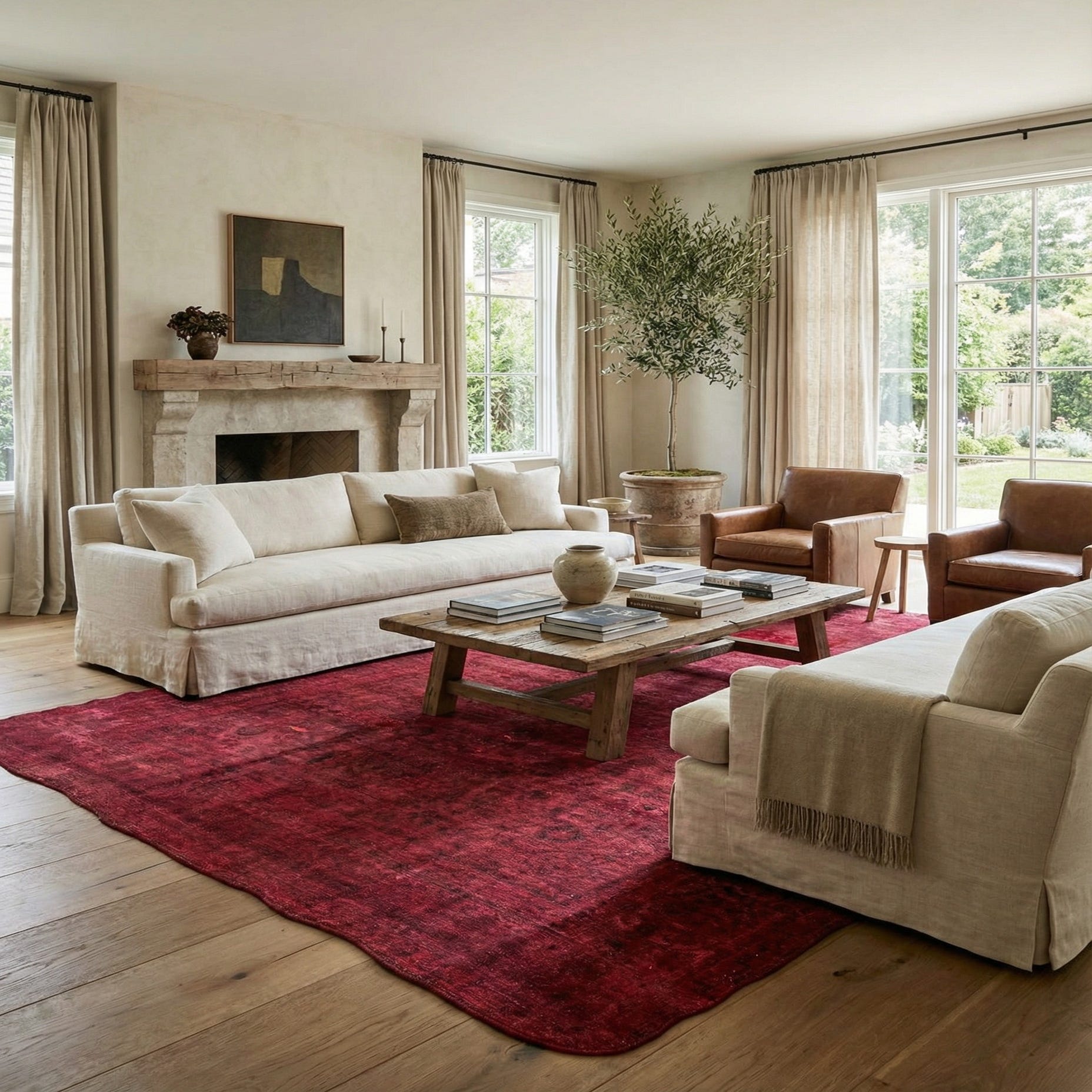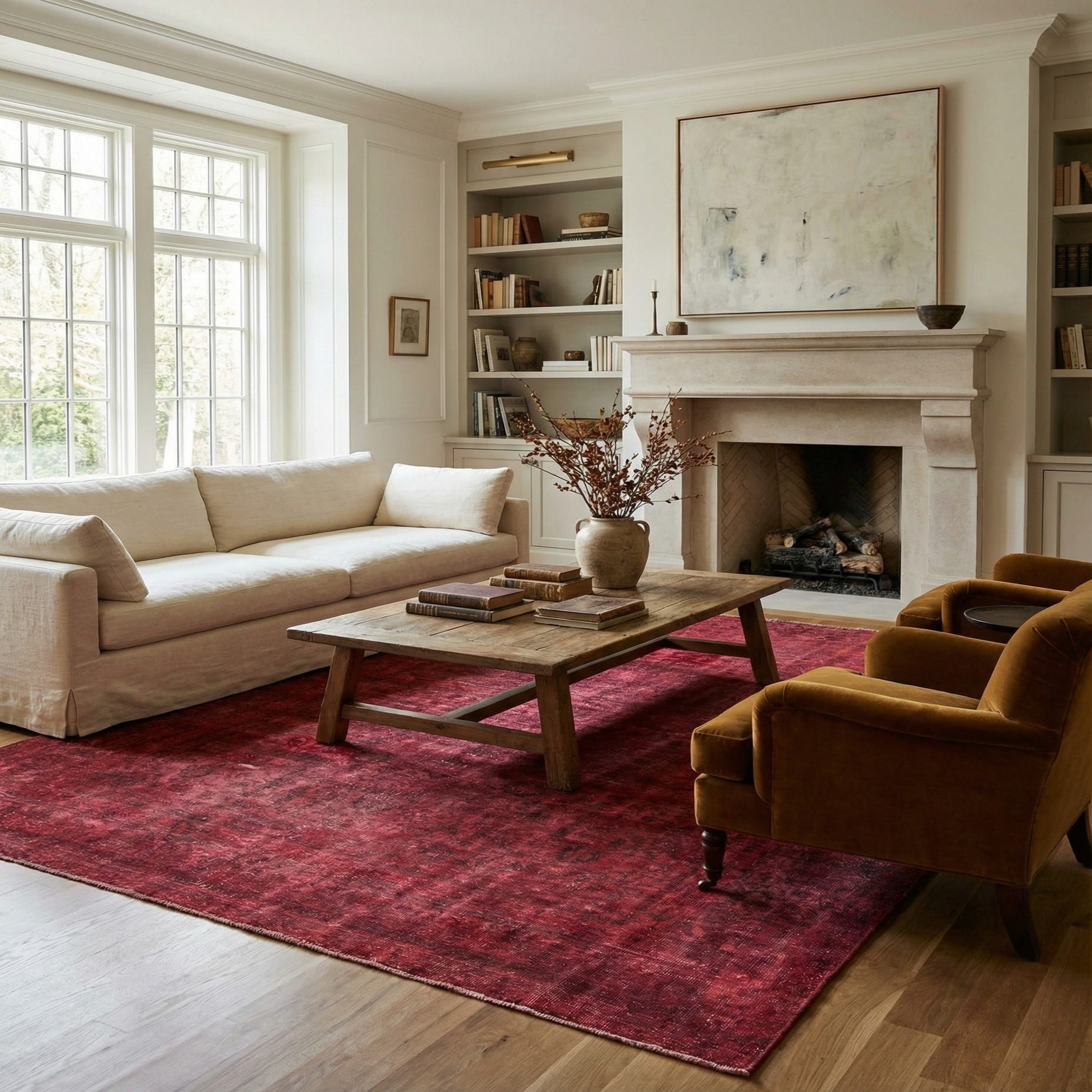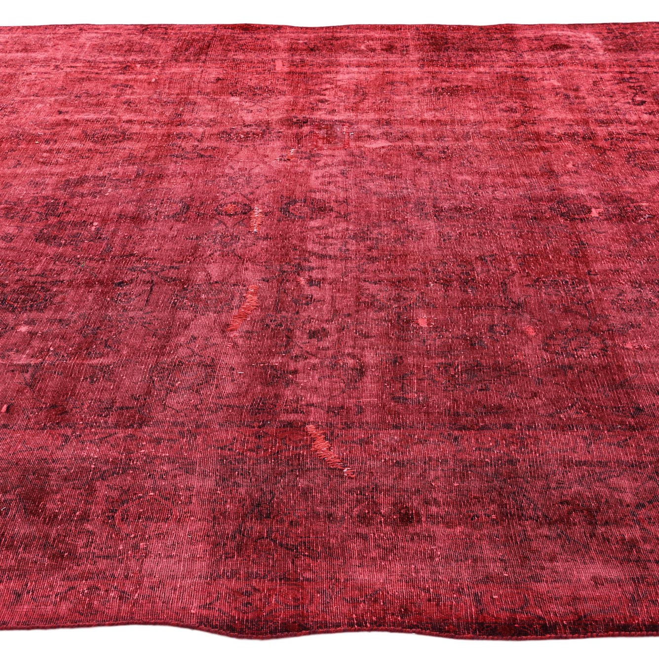 A large 8x12 rectangular Ultra Vintage rug in deep red, featuring a distressed Persian-style pattern and a flat pile.