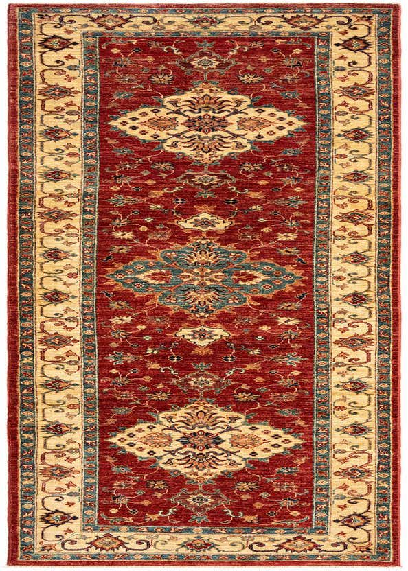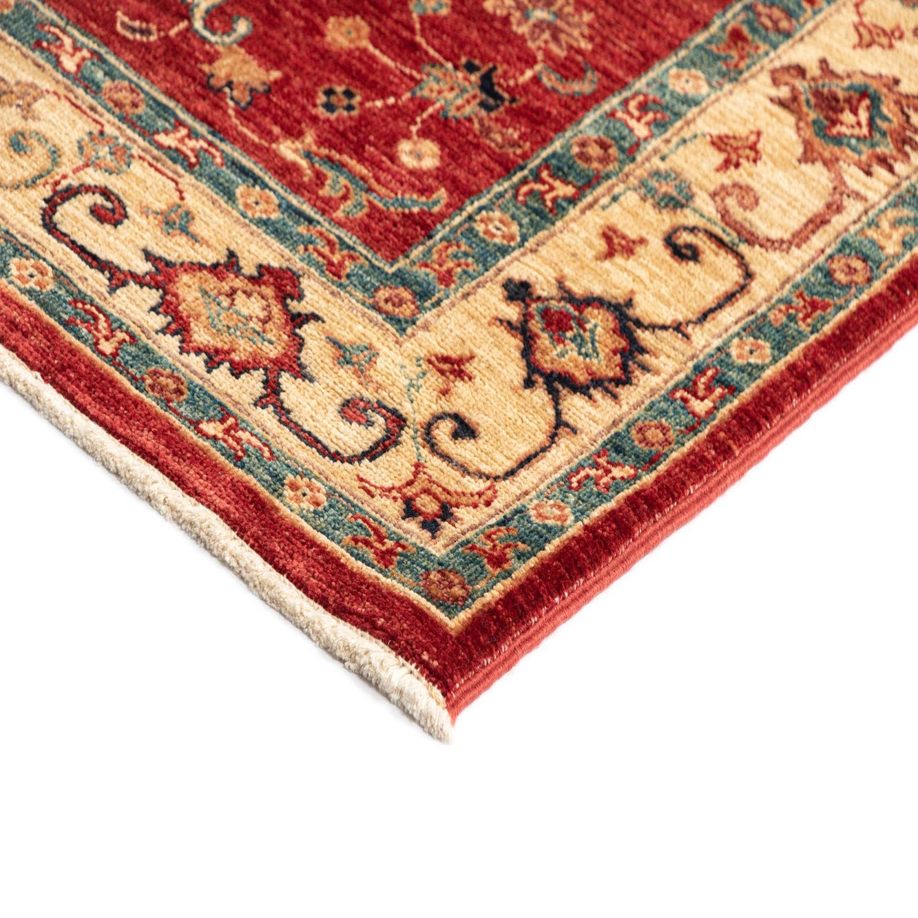 The Ariana Ziegler collection presents a 9-foot runner, meticulously handcrafted from 100% wool, offering a dense and plush feel underfoot. This elegant runner showcases a traditional oriental pattern with a vibrant red background, enriched by a sophisticated color palette that includes shades of beige, green, black, and brown. Intricate floral motifs and embellishments add depth and visual interest to the design, while the contrasting border frames the piece with finesse.