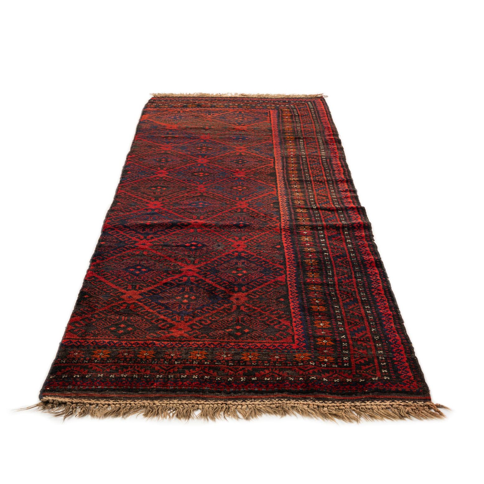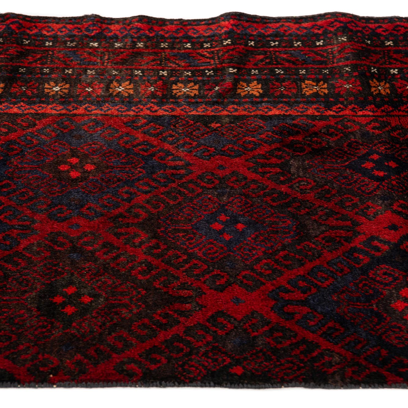 A 9 ft Balouch runner rug in deep reds and black, featuring a tribal geometric pattern with fringe.
