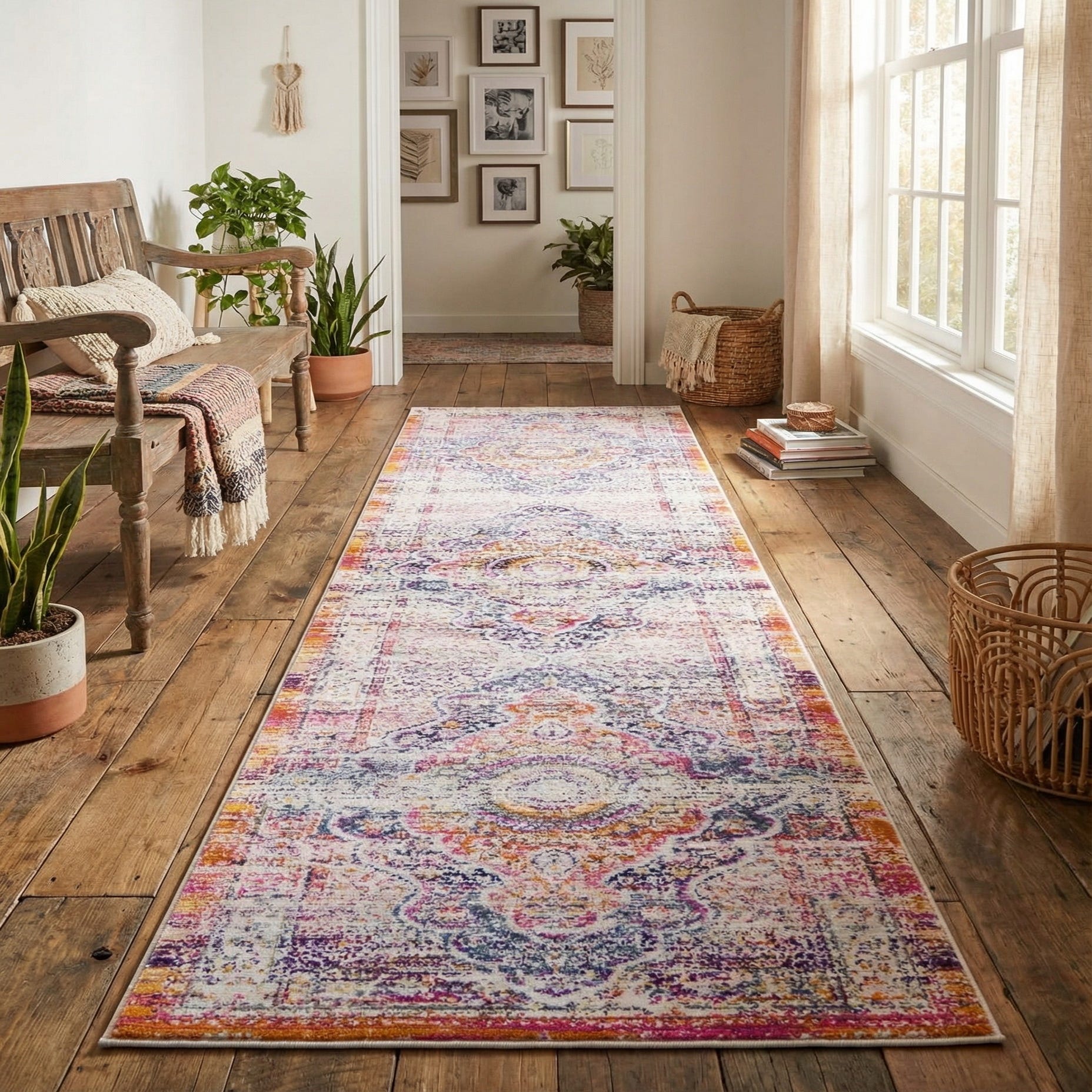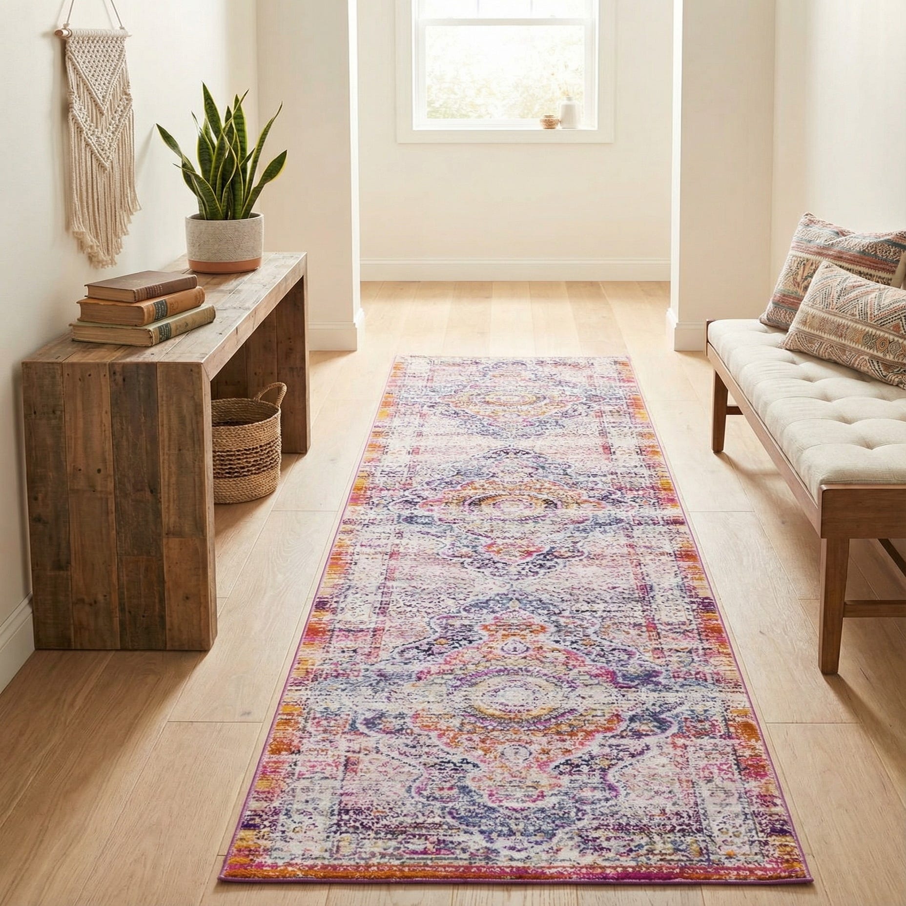 Planned for narrow spaces, this runner works well in hallways, entryways, alongside a kitchen island or layered at the foot of a bed. It pairs nicely with warm wood floors, neutral upholstery, and eclectic or transitional decor—think mixed textiles, brass or matte-black accents, and vintage furnishings. Use it to introduce color and pattern into a compact area without overpowering existing decor.