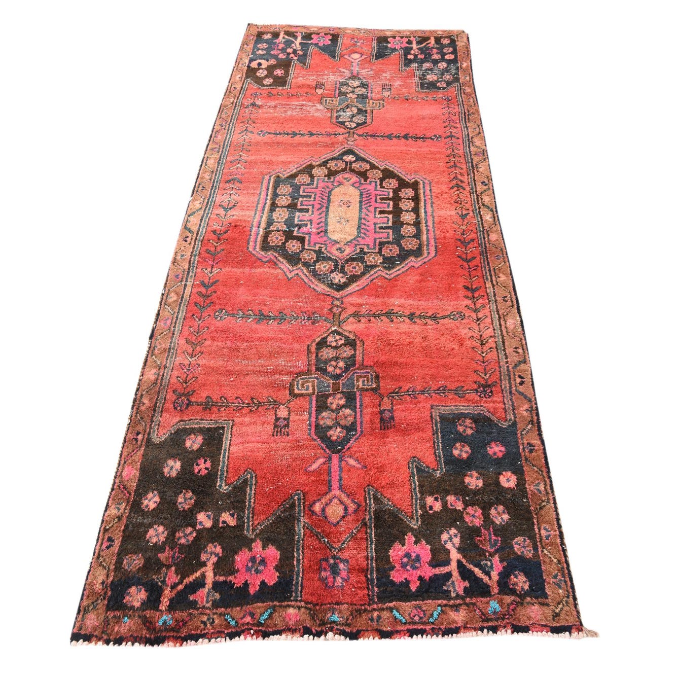 A 9 ft Hamedan runner rug featuring a traditional Persian medallion pattern in reds, dark blues, and pinks, ideal for a hallway.