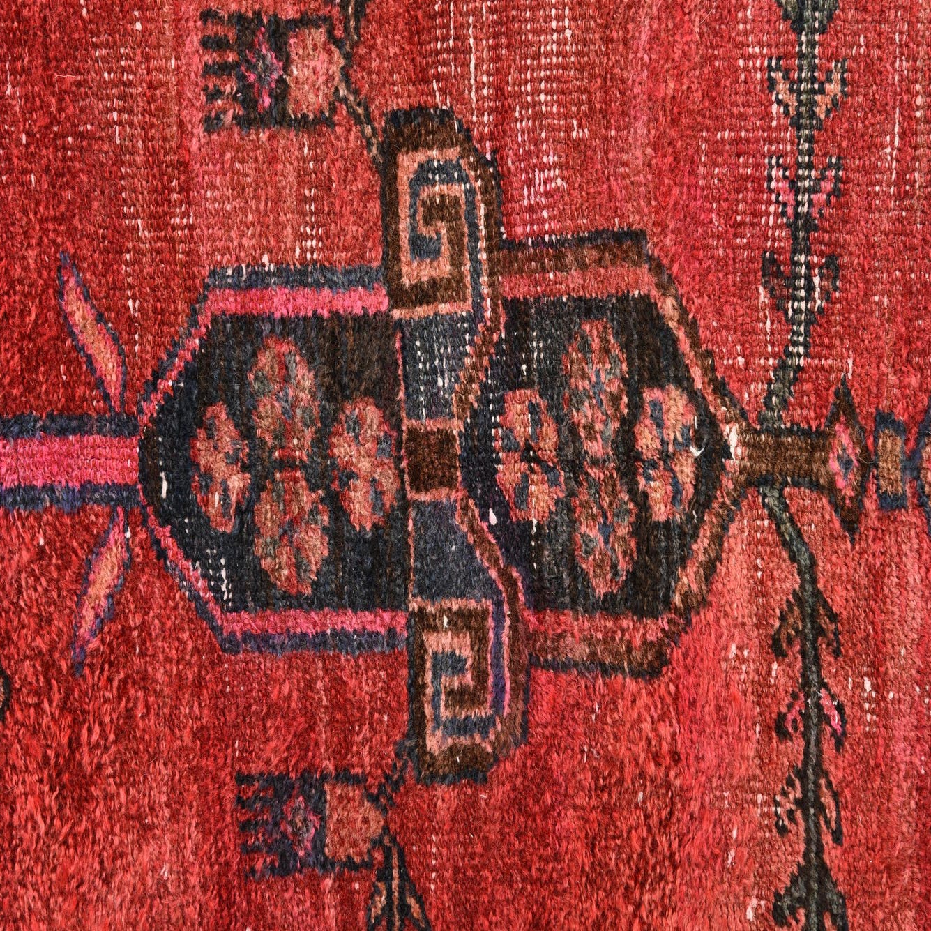 Primary color is Red. Colors in this rug include: Red, Brown, Navy Blue, Blue.
