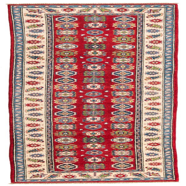 Primary color is Red. Colors in this rug include: Red, Blue, Brown, Ivory, Navy Blue, Green.