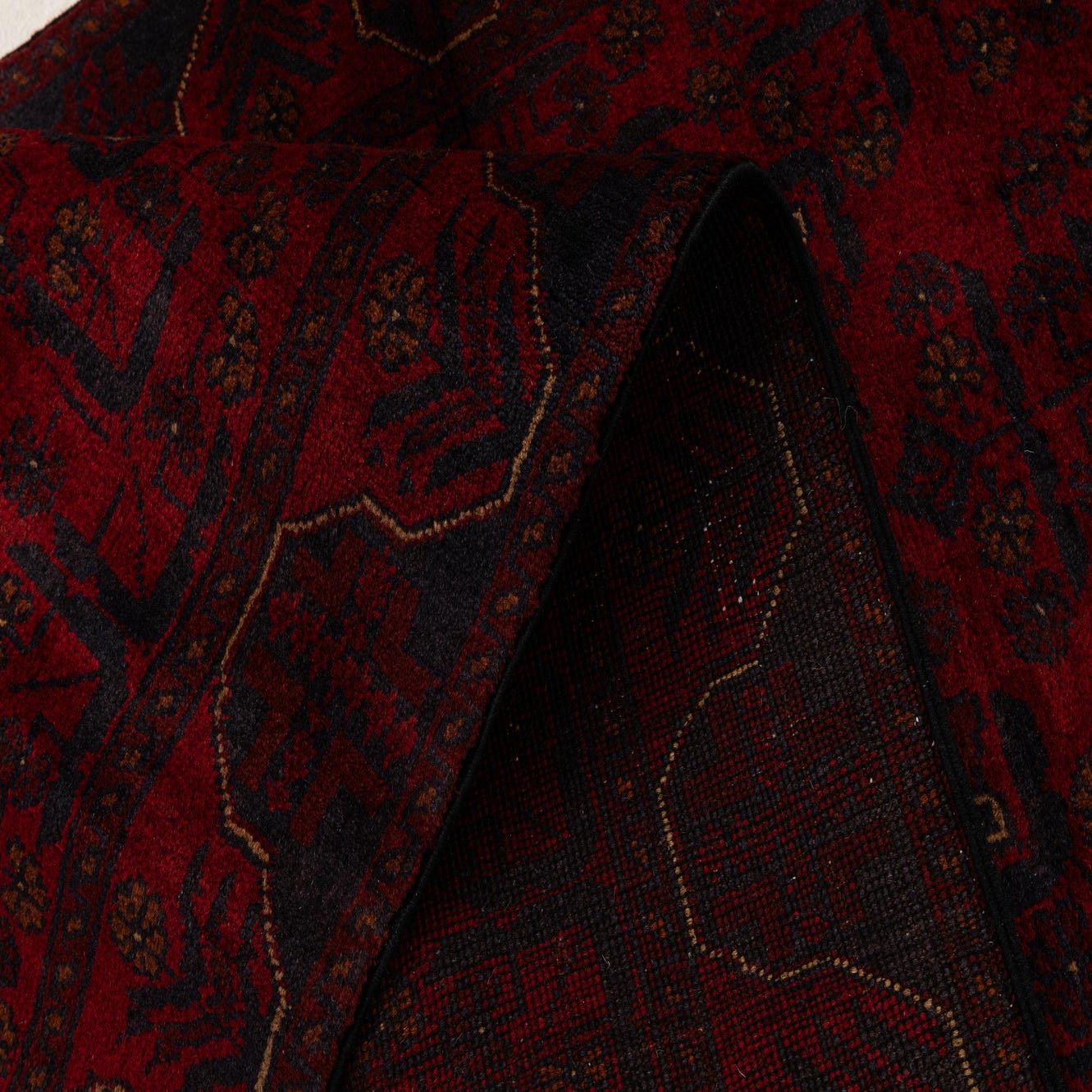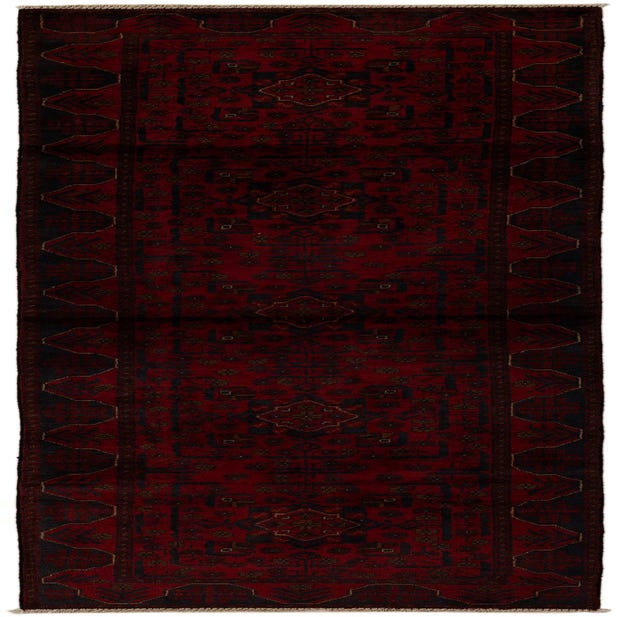 Primary color is Red. Colors in this rug include: Red, Black, Brown, Burgundy.