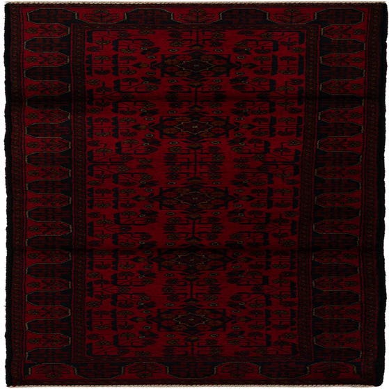 Primary color is Red. Colors in this rug include: Red, Brown, Navy Blue.