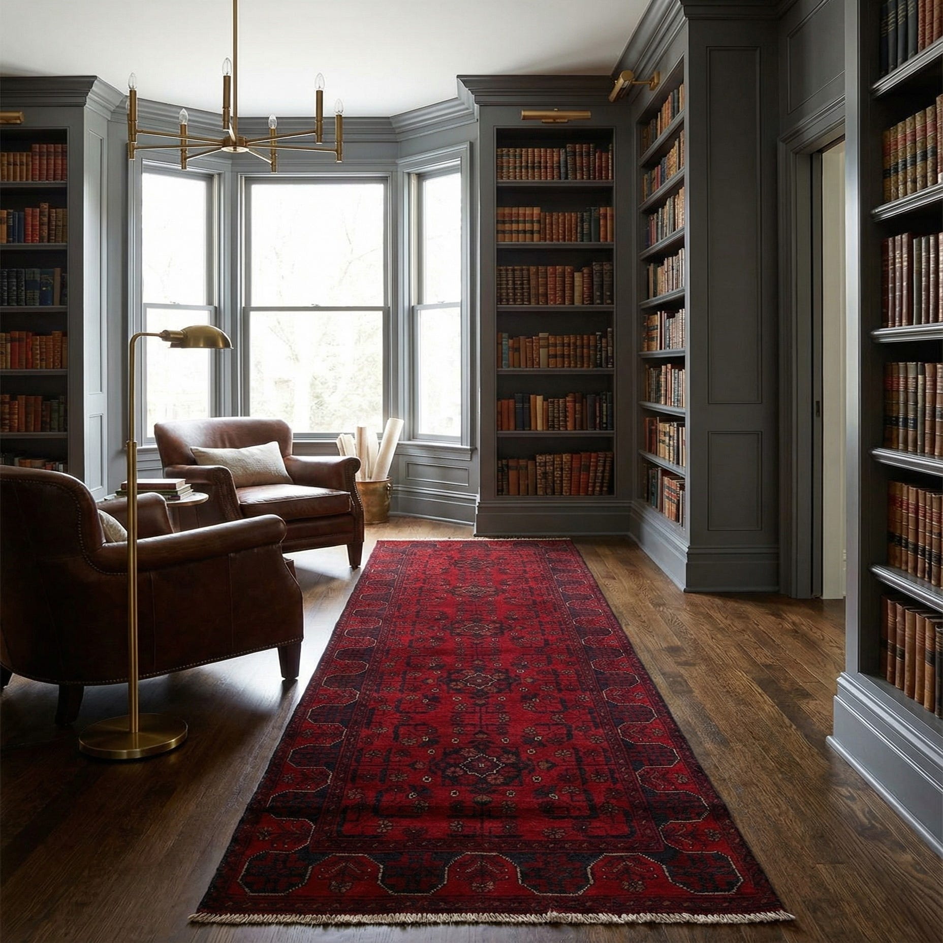 A 9 ft red runner rug with a thin pile, featuring a modern geometric pattern in dark red and black, ideal for a hallway.