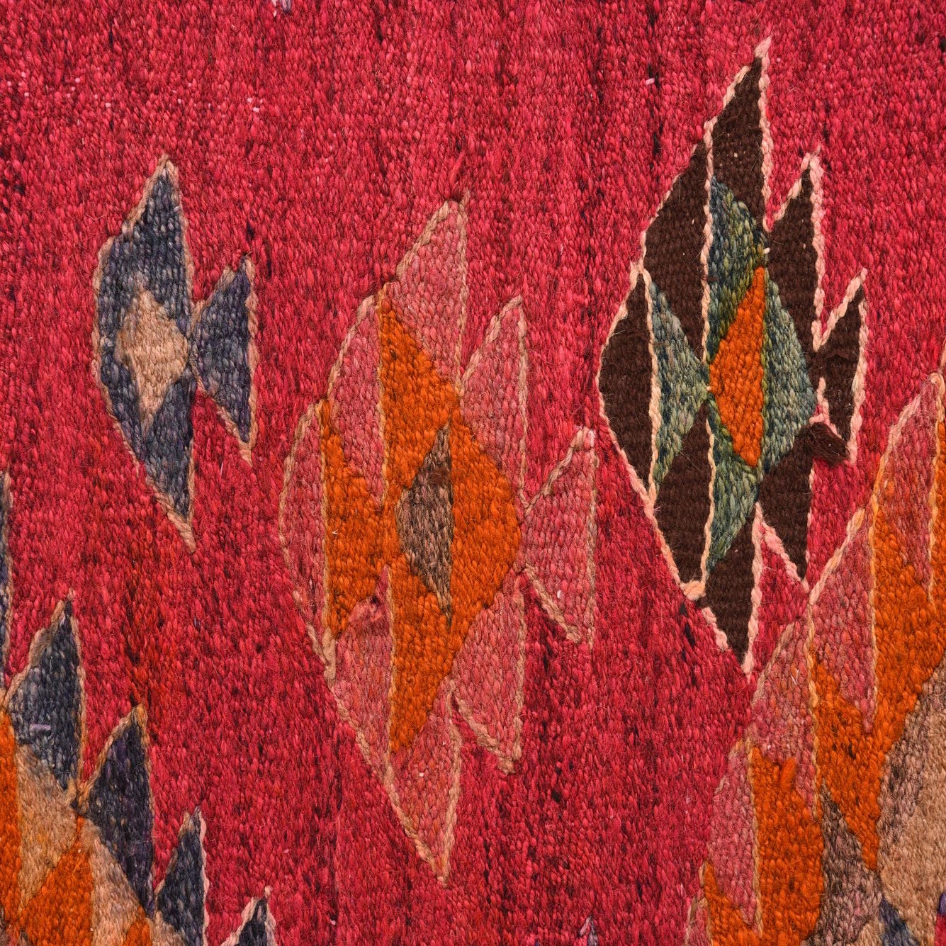 A vibrant red Kilim Fars runner rug with intricate tribal geometric patterns in blues, oranges, and pinks, perfect for a hallway.