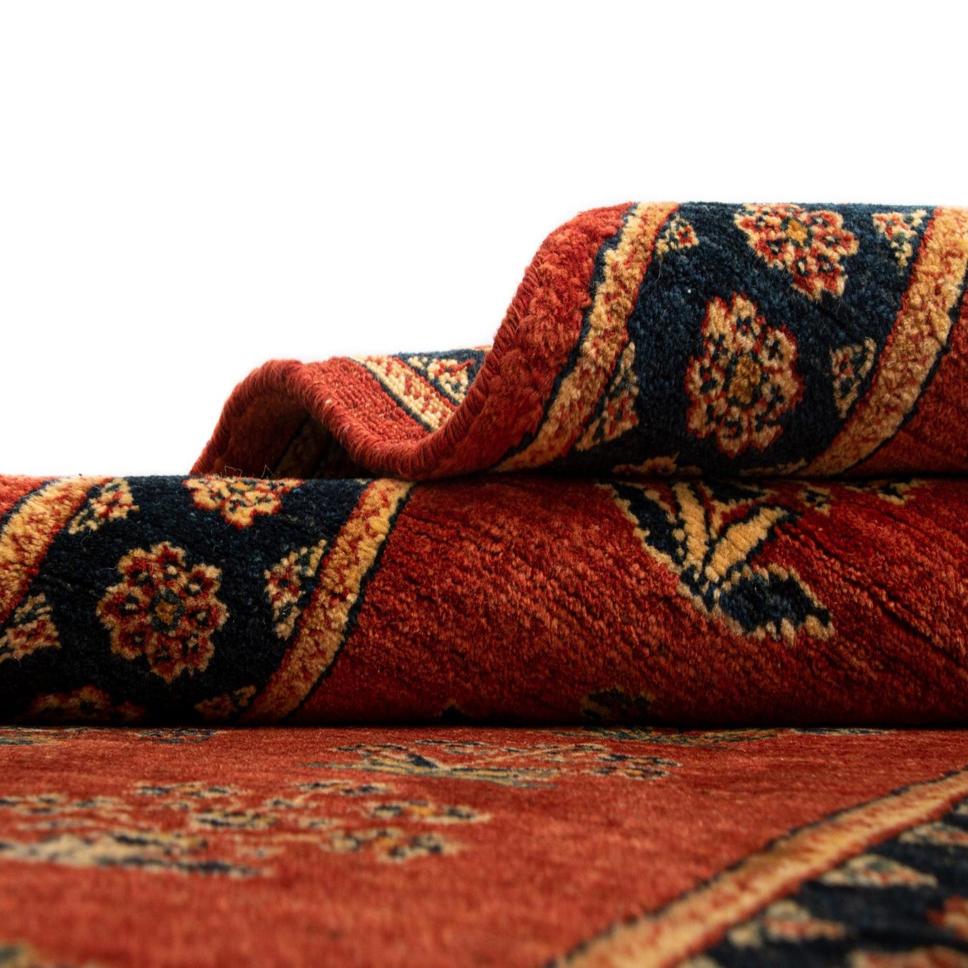 A 9 ft red Persian runner rug with a repeating floral pattern and a dark border, ideal for a hallway.