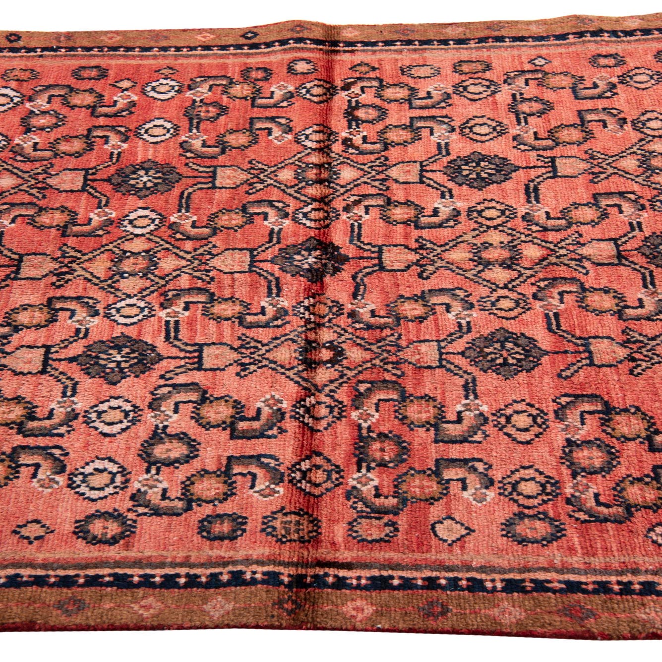 A 9 ft runner rug with a vibrant red field and a stepped navy border, featuring intricate Persian-style medallions and floral motifs.