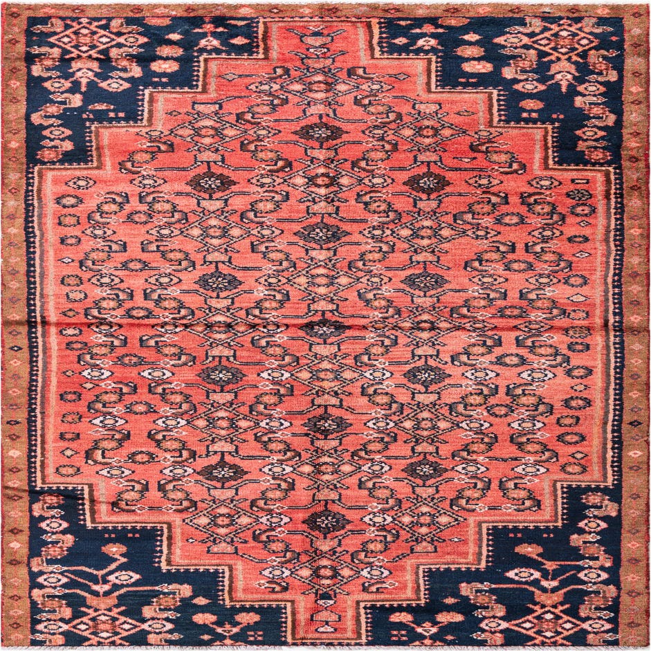 Primary color is Red. Colors in this rug include: Red, Brown, Navy Blue.
