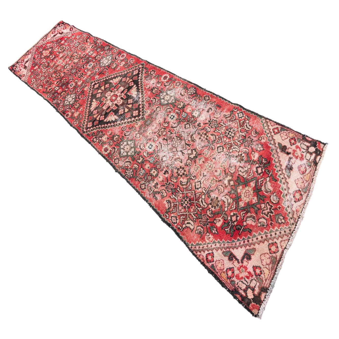 A 9 ft red runner rug with a faded Persian medallion pattern, ideal for a hallway.
