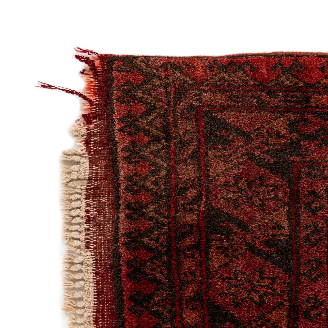 A rectangular 9x11 Afghan Akhche tribal rug featuring a deep red field with repeating dark geometric patterns and a complex border.