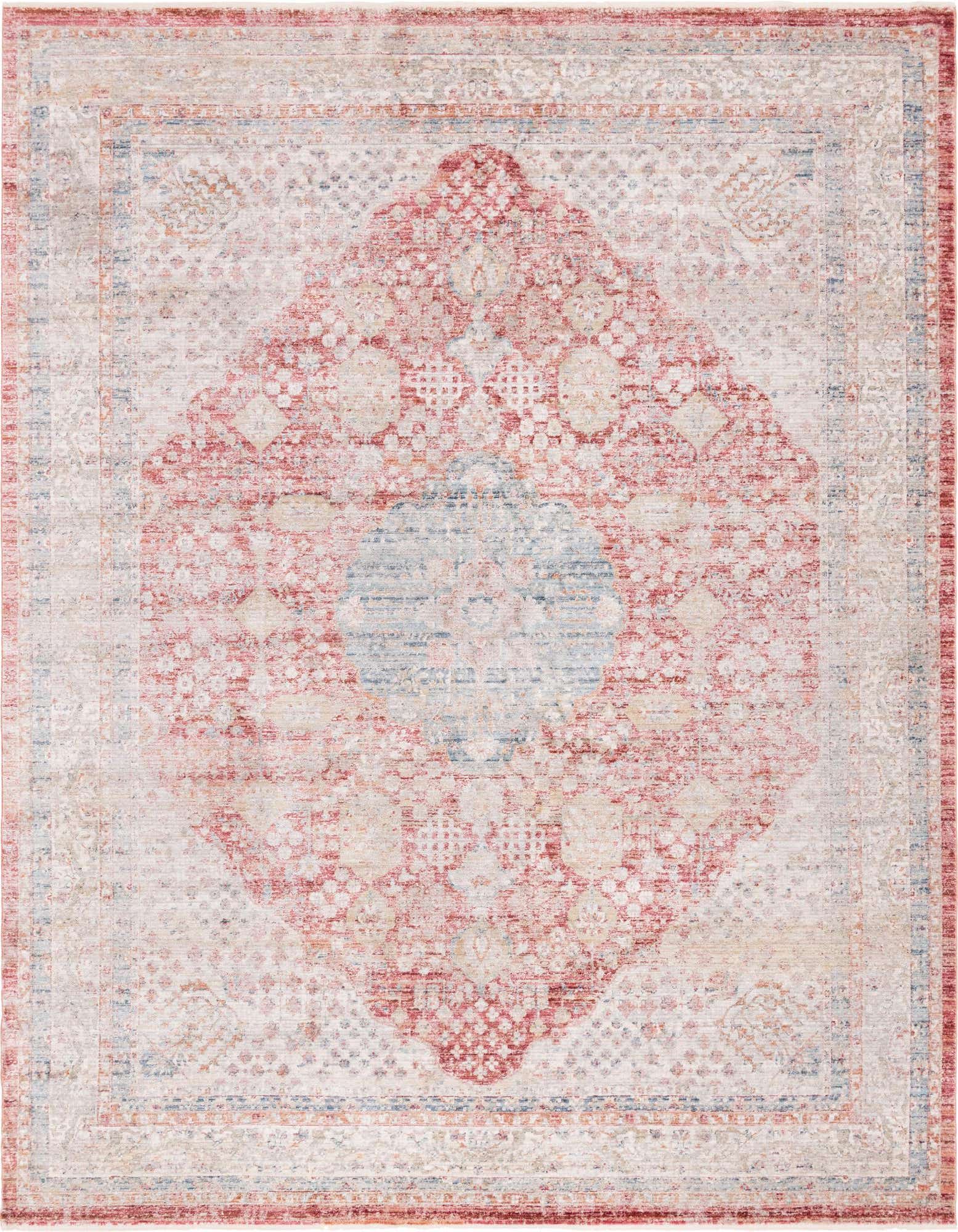 Primary color is Red. Colors in this rug include: Red, Blue, Gray, Navy Blue, Ivory, Olive.