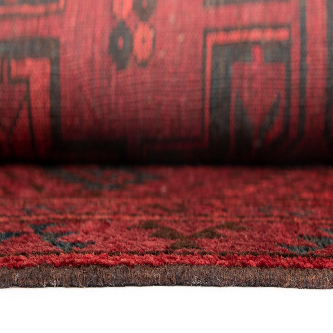 A 9x12 rectangular Afghan rug in deep reds with a repeating tribal geometric pattern and fringed ends.
