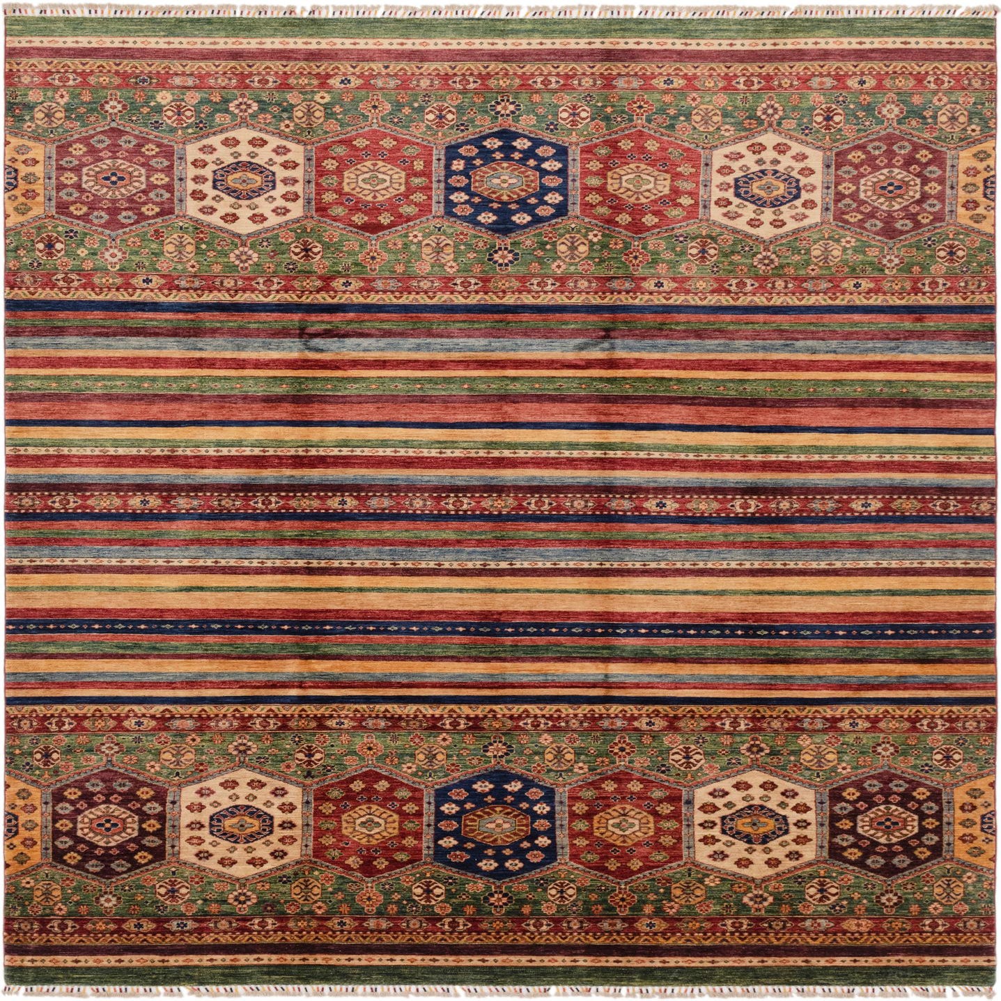 A 9x12 rectangular Ariana Ziegler rug featuring a vibrant Southwestern tribal pattern with red, green, blue, and gold stripes, and intricate hexagonal medallions.