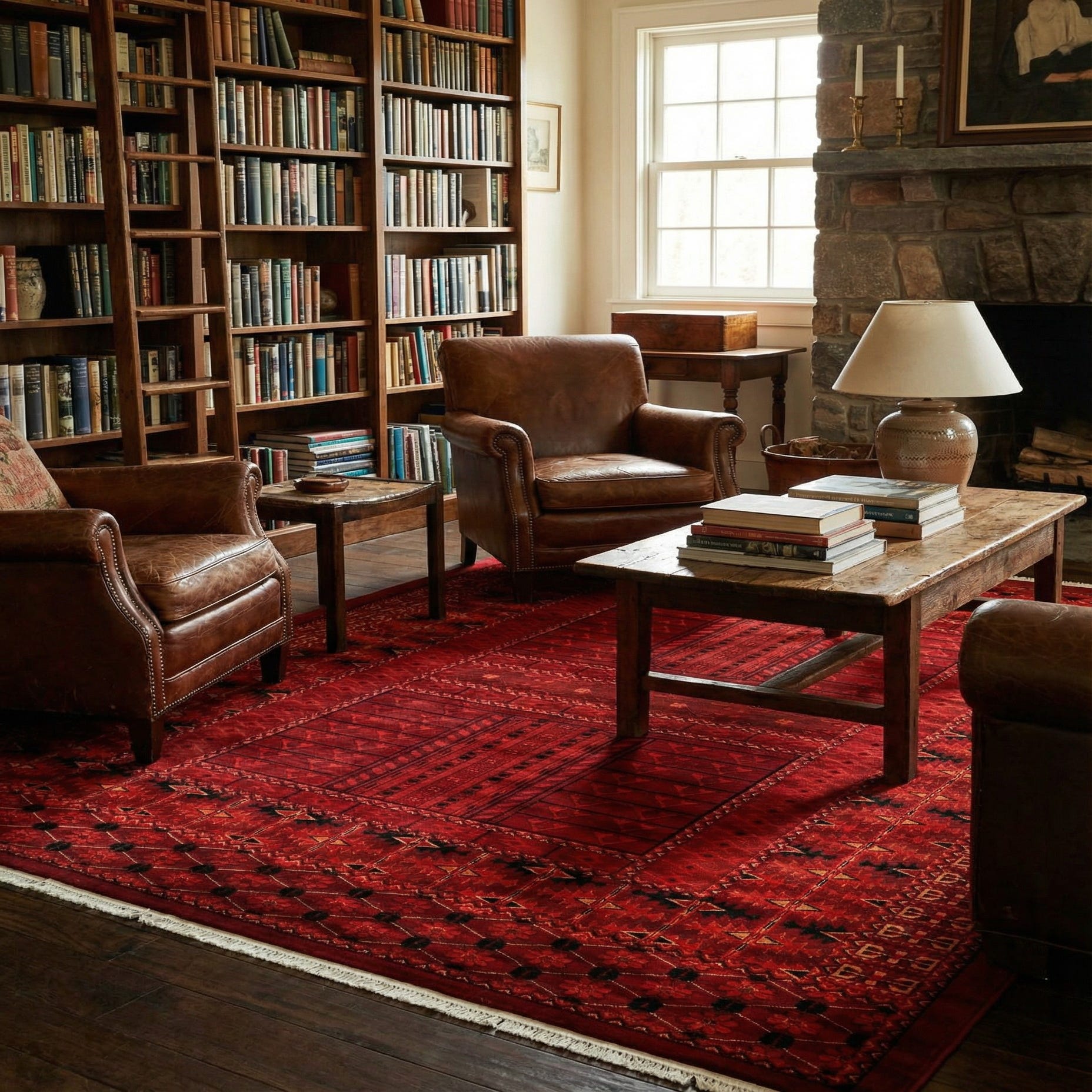 Given its robust red hue and elaborate design, this rug is well-suited for spaces that aim to create a warm and inviting atmosphere. It would work well in a formal living room, dining area or any space where a touch of traditional elegance is desired. The rug's bold color scheme would pair excellently with neutral furniture and wooden accents, providing a focal point within a subdued color palette. It can also harmonize with more vibrant decors, echoing similarly rich tones found in decorative elements.