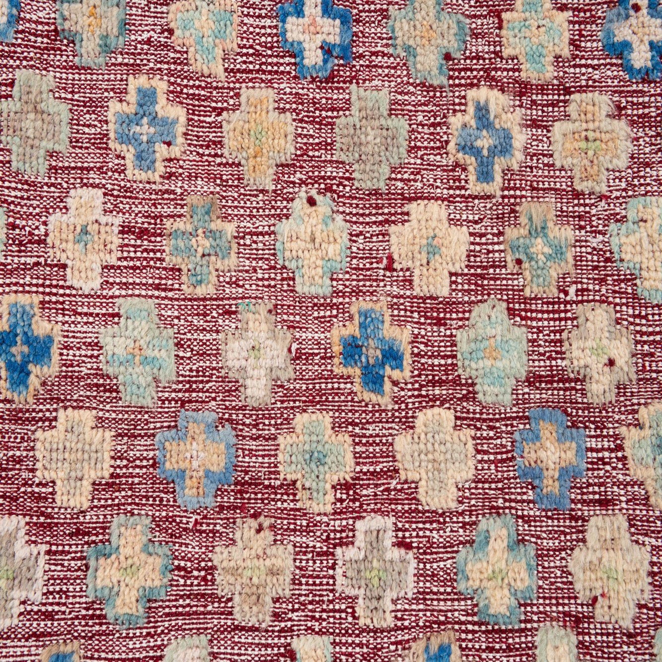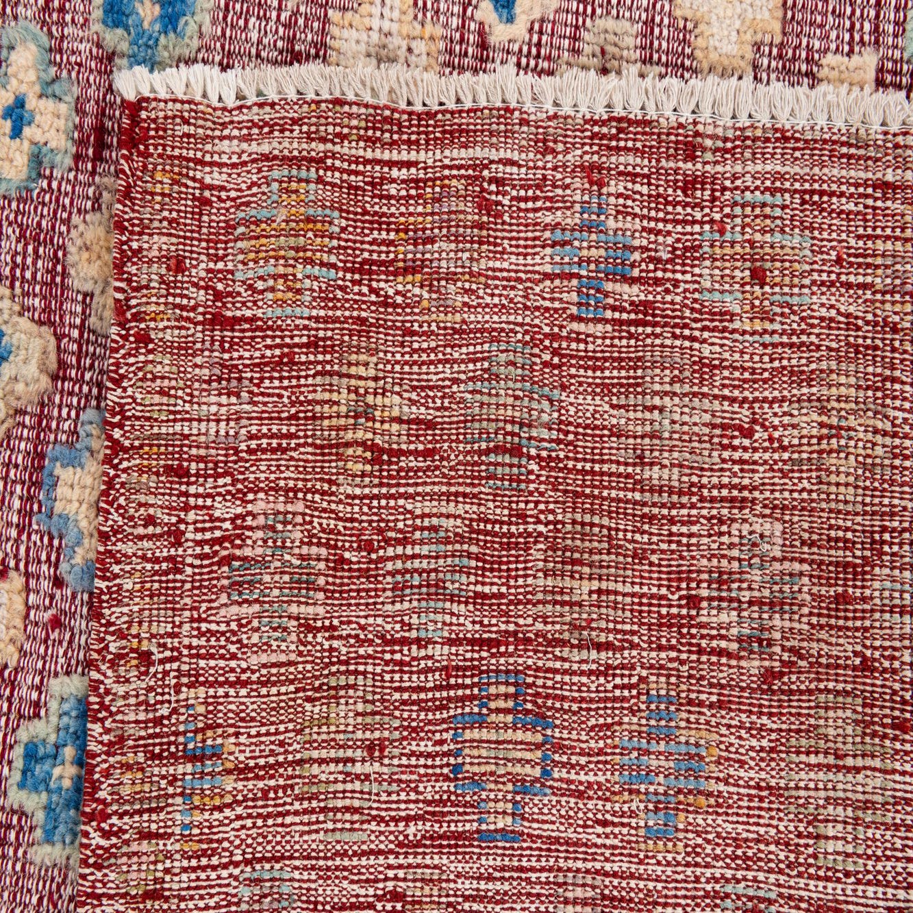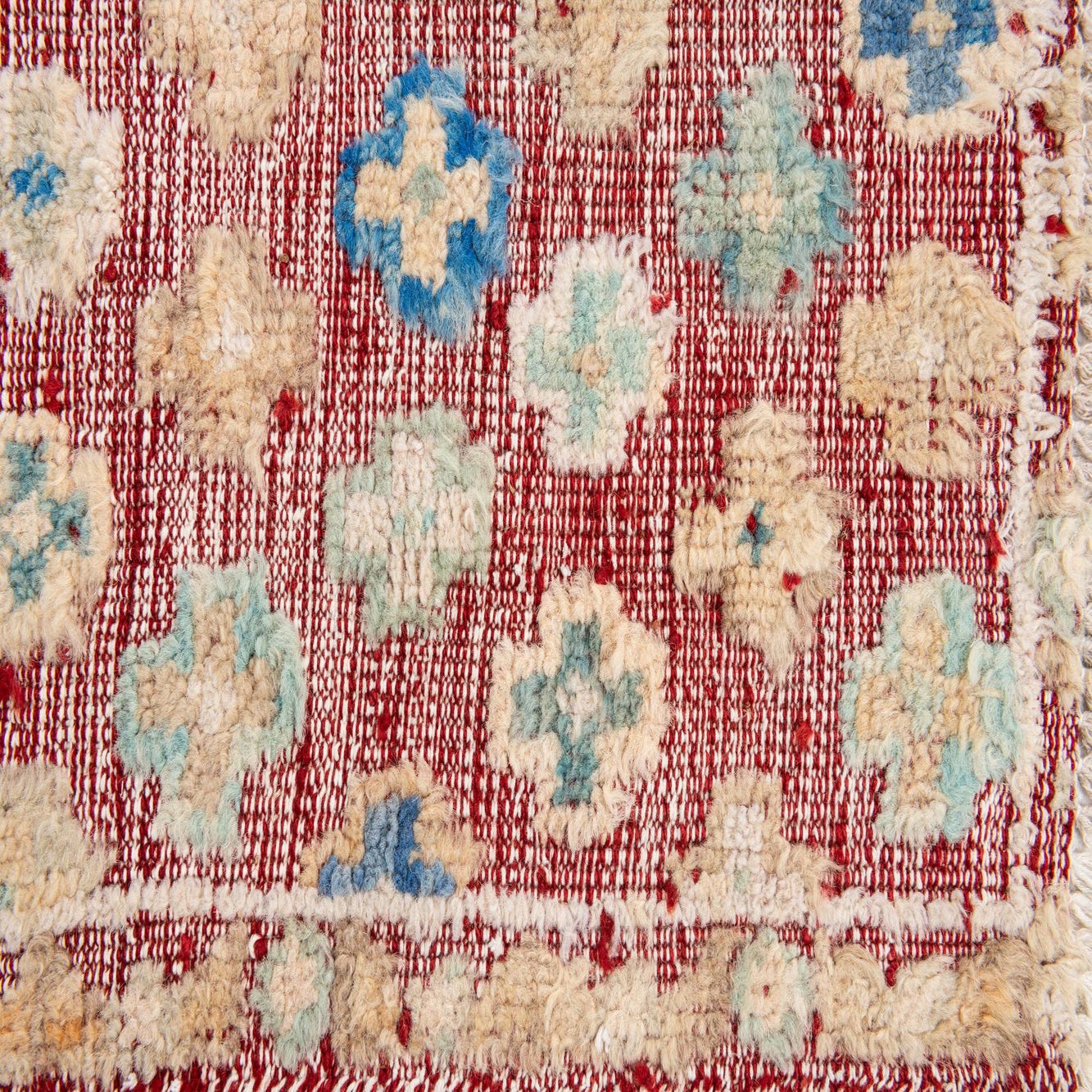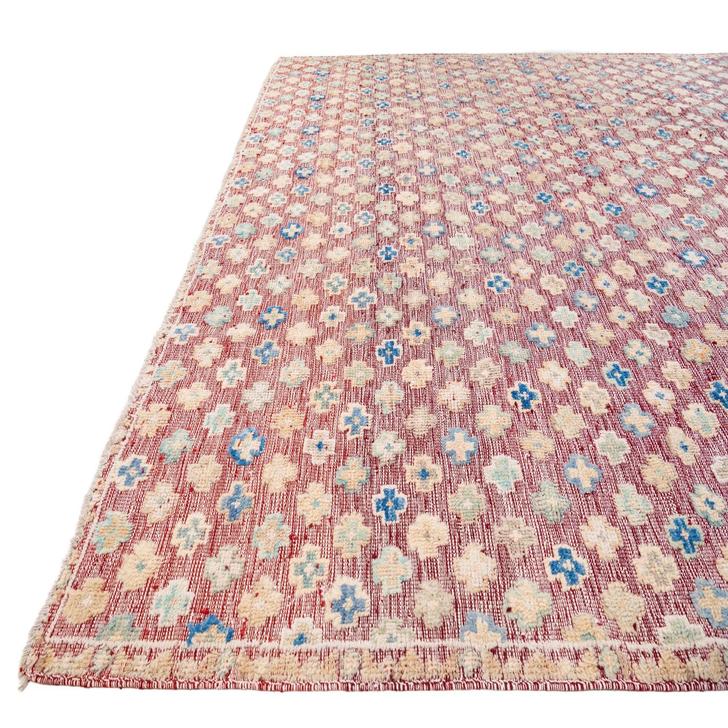 A richly patterned field of small, repeating floral and quatrefoil motifs rests on a warm red ground, with accents of beige, ivory, blue, and green punctuating the layout. The design has a classic, low-contrast look—colors are muted and layered, giving the surface visual depth without strong highlights. Hand-knotted of 100% wool, the weave produces a soft, textured surface that feels warm underfoot while retaining a defined, slightly rustic hand.