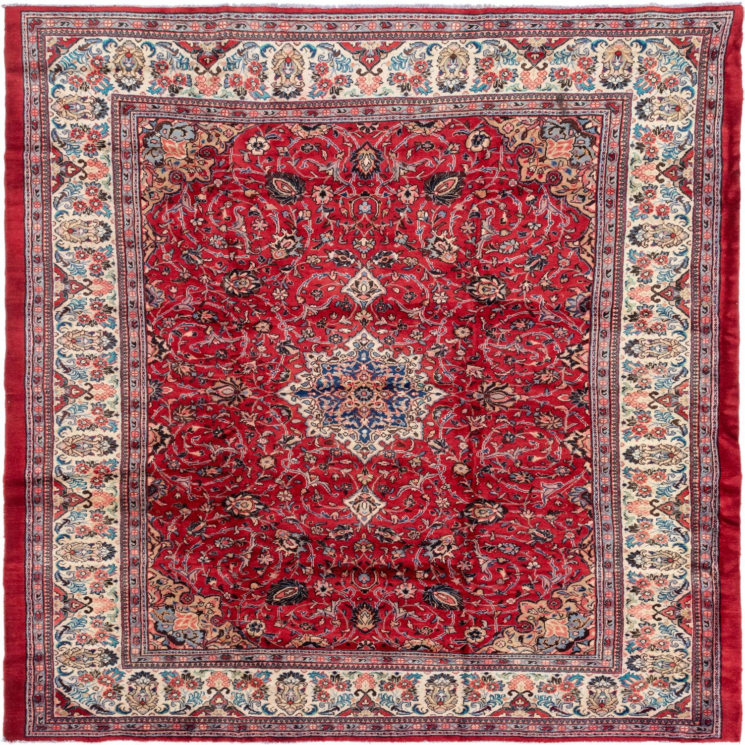 A 9x12 rectangular Farahan rug with a rich red field, intricate botanical patterns, and a central medallion, ideal for a traditional living room.