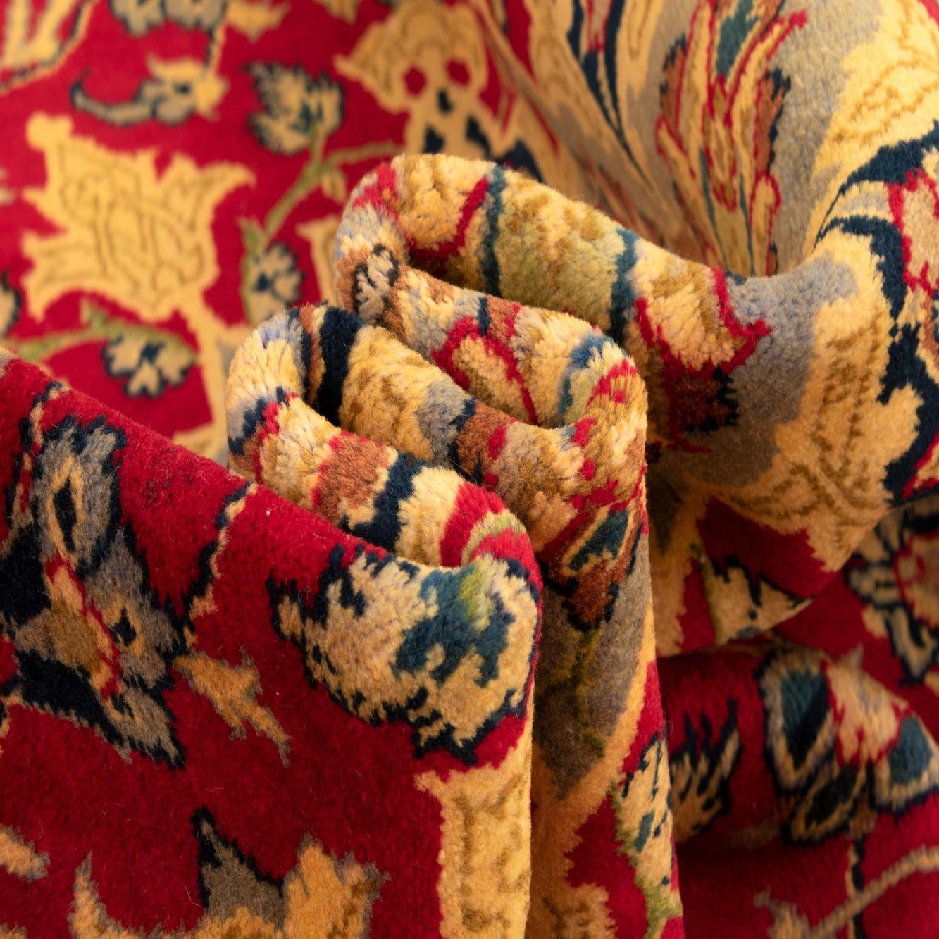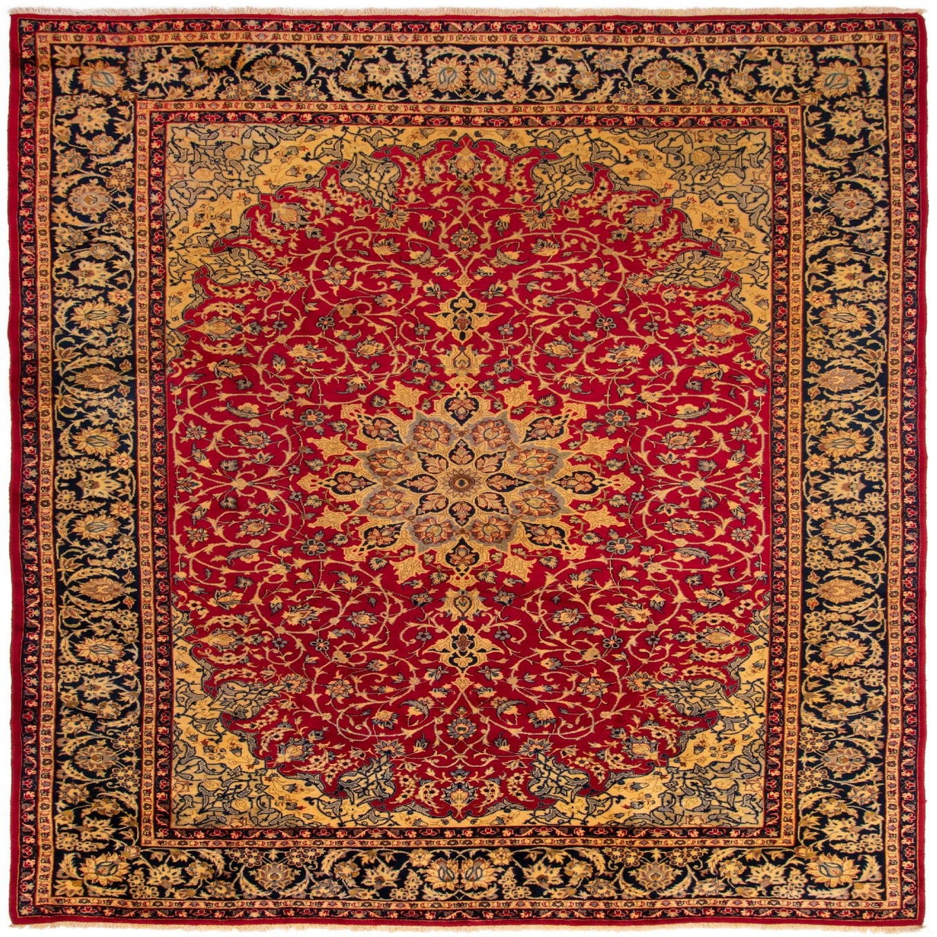 A 9x12 rectangular Isfahan Persian rug in rich red with an ornate gold and navy floral medallion and border.