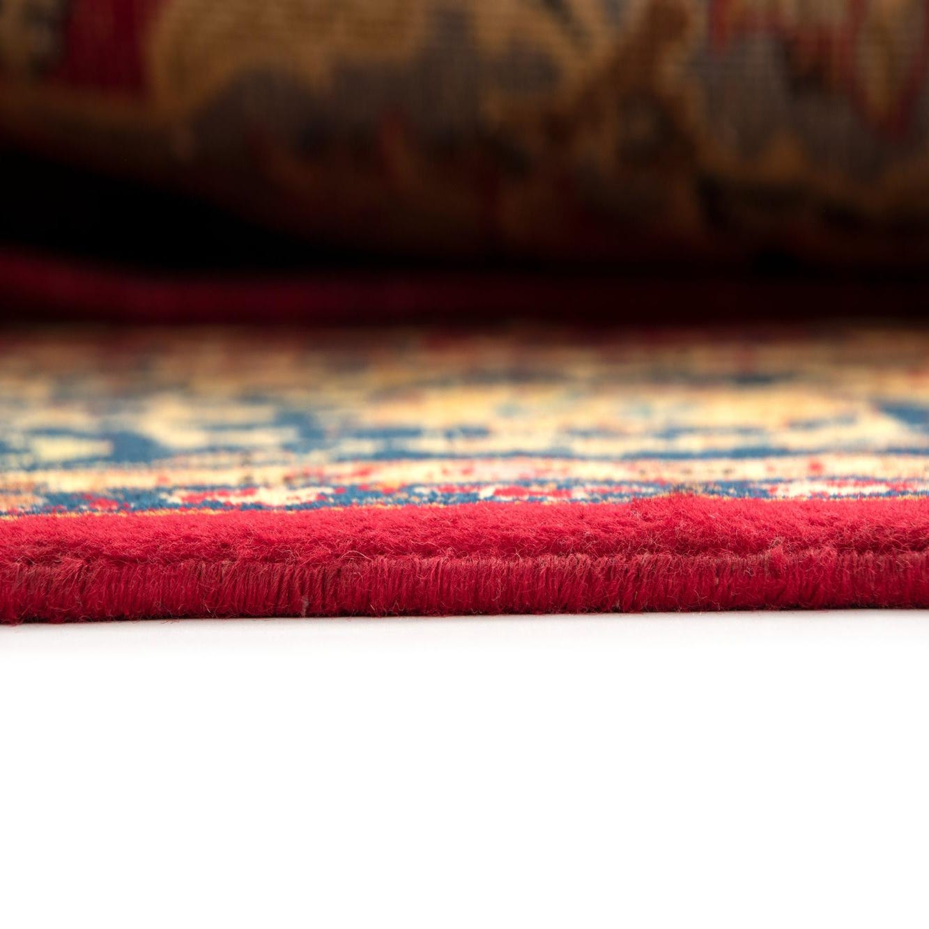 Primary color is Red. Colors in this rug include: Red, Dark Blue, Yellow, Beige.