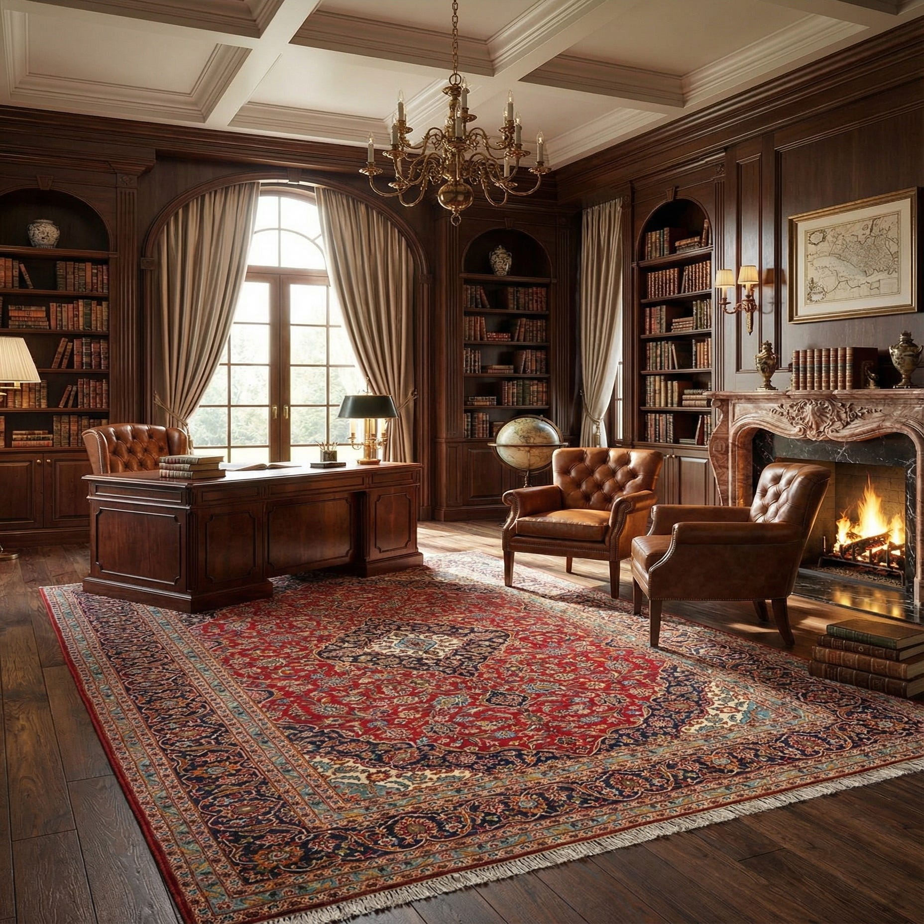 A 9x12 rectangular Kashan Persian rug with a rich red field, intricate floral patterns, and a dark blue border.