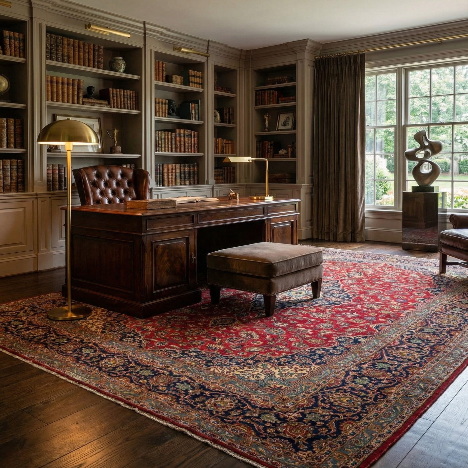 The historical charm of this Kashan rug would harmonize with classical decor, complementing wood finishes and rich fabric upholstery, or it could serve as an anchor point in a more eclectic setting, bringing contrast to modern furnishings. It effortlessly adapts to both formal and inviting spaces, infusing them with a sense of warmth and refined taste.