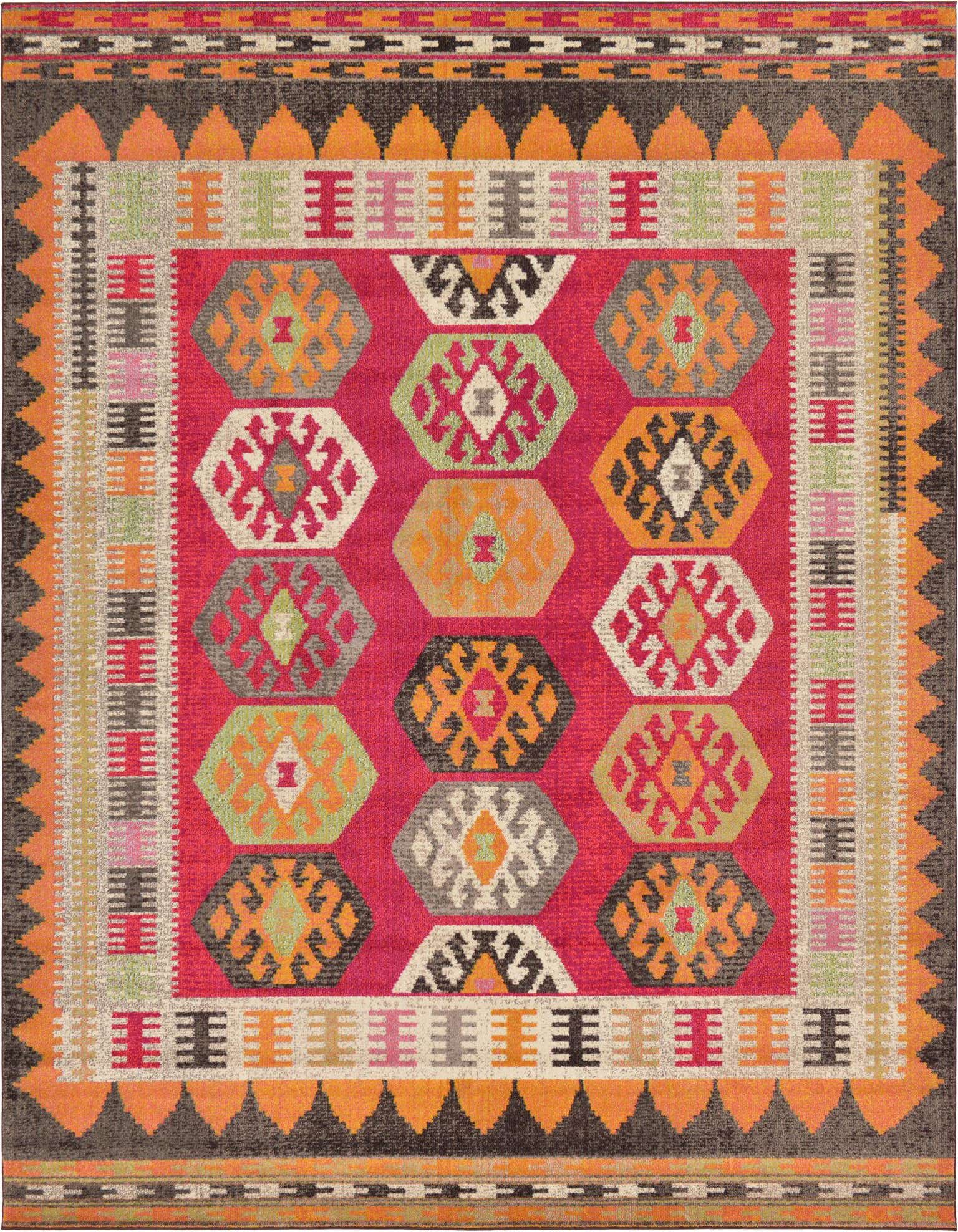 Primary color is Red. Colors in this rug include: Red, Brown, Green, Ivory, Orange, Peach, Puce, Yellow, Pink, Gray.