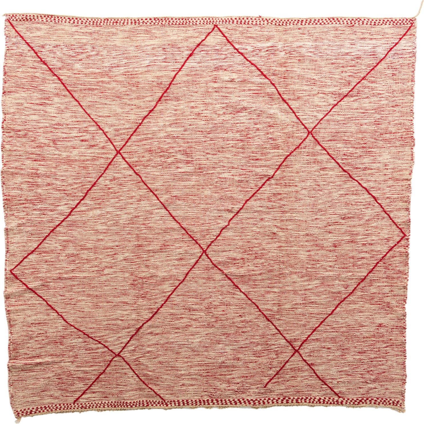 From the Moroccan collection, this hand-knotted piece is crafted of 100% wool, highlighting the traditional craftsmanship and rich heritage of Moroccan rug-making. Measuring 9x12, it presents a bold red background accentuated by ivory lines that create large, diamond-shaped patterns. This semi-antique rug, aged between 40-60 years, offers a connection to the past while remaining relevant in contemporary design aesthetics.