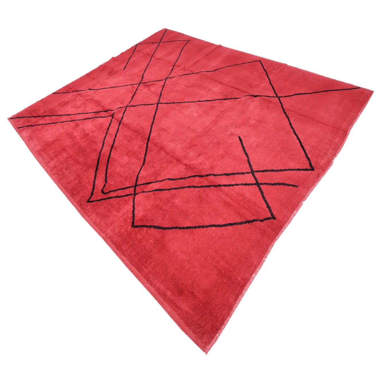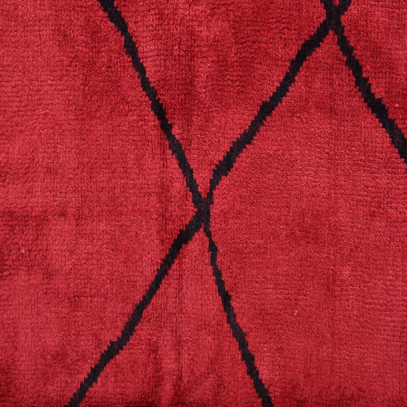 A 9x12 rectangular red shag rug with an abstract black tribal pattern, perfect for a living room.