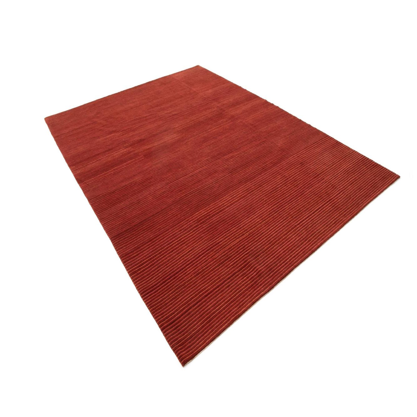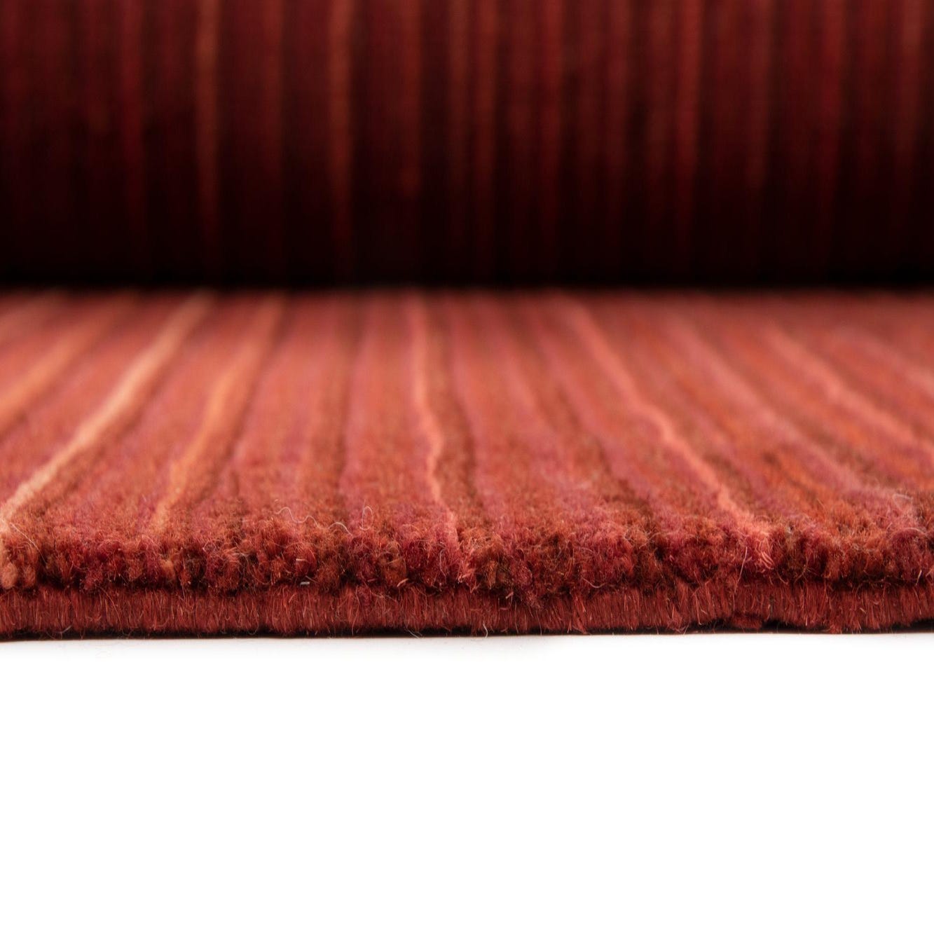 This hand-made Odegard wool rug features a sophisticated, minimalist design, presenting a rich, red background with a subtle, linear texture that adds depth and visual interest without overwhelming the space. With its generous 9x12 dimensions, this rug lends a sense of warmth and luxury to any room.